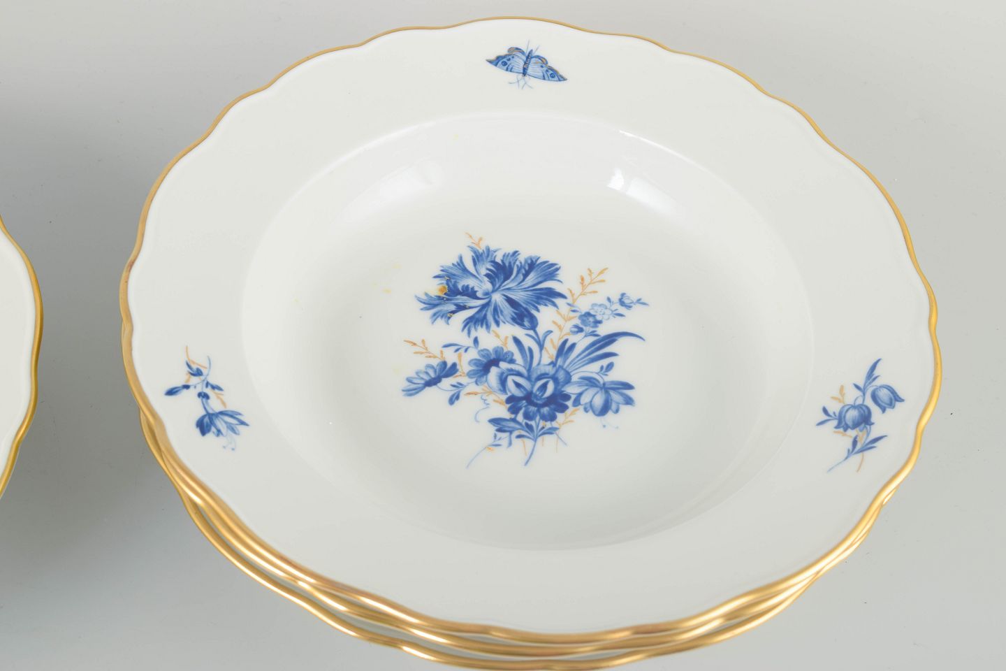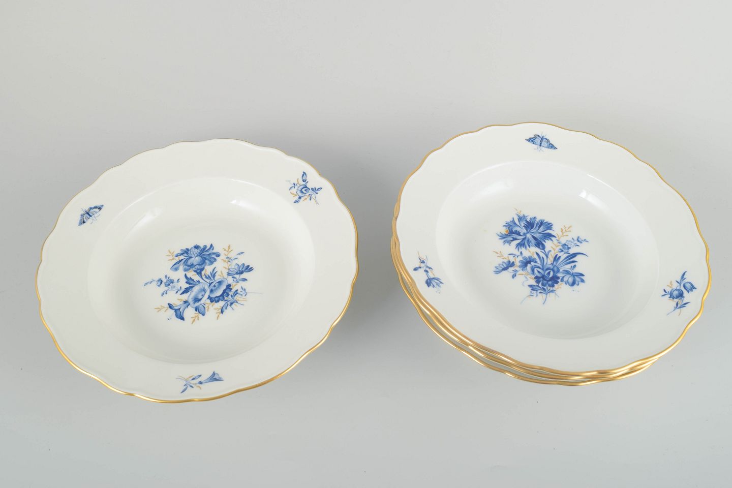 Hånddekoreret porcelæn med håndmalet blå blomsterdekoration og forgyldte stafferinger langs kanten. Klassisk bølget form.