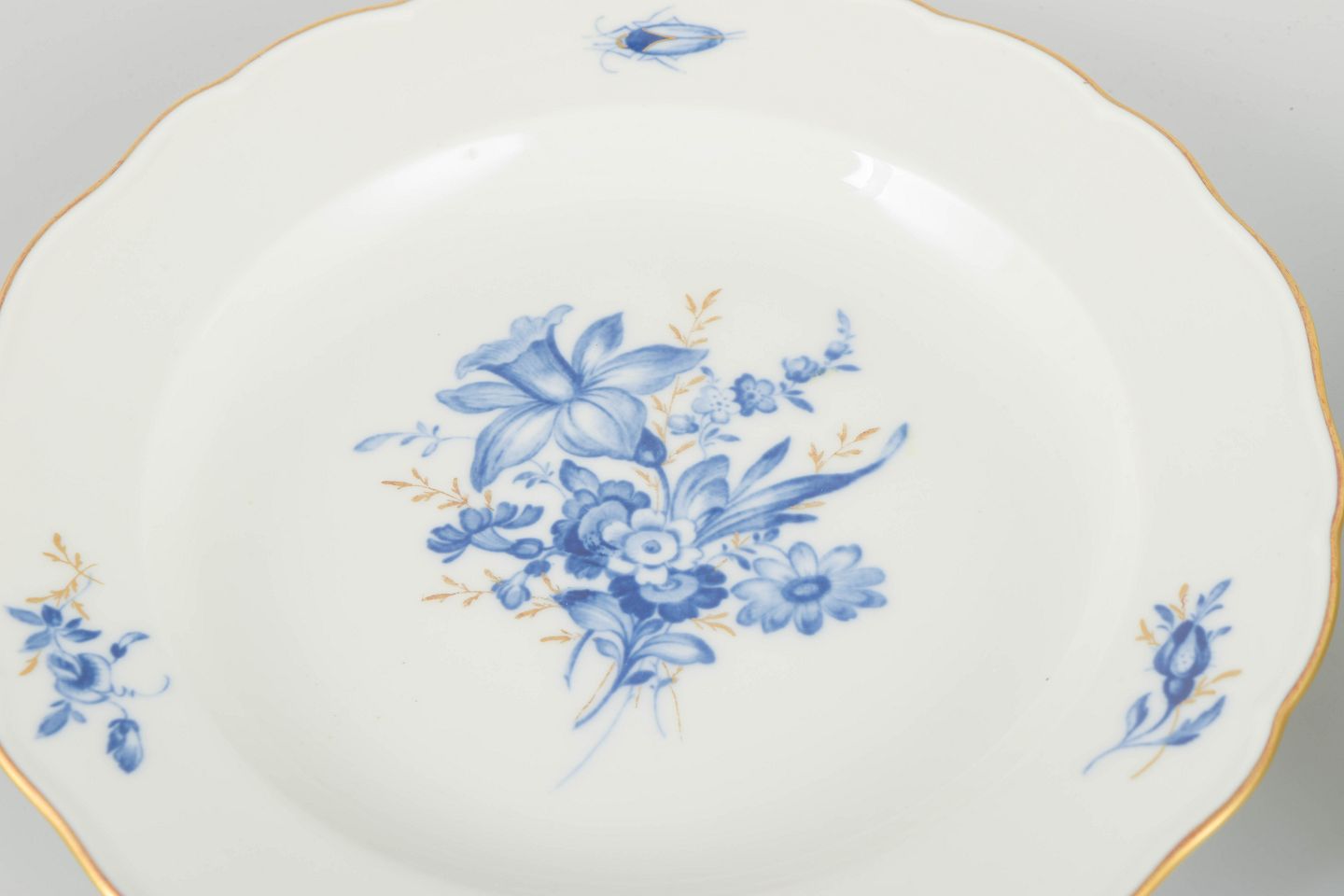 Hånddekoreret porcelæn med håndmalede blå blomsterdekorationer og forgyldte stafferinger langs kanten. Klassisk let bølget form.