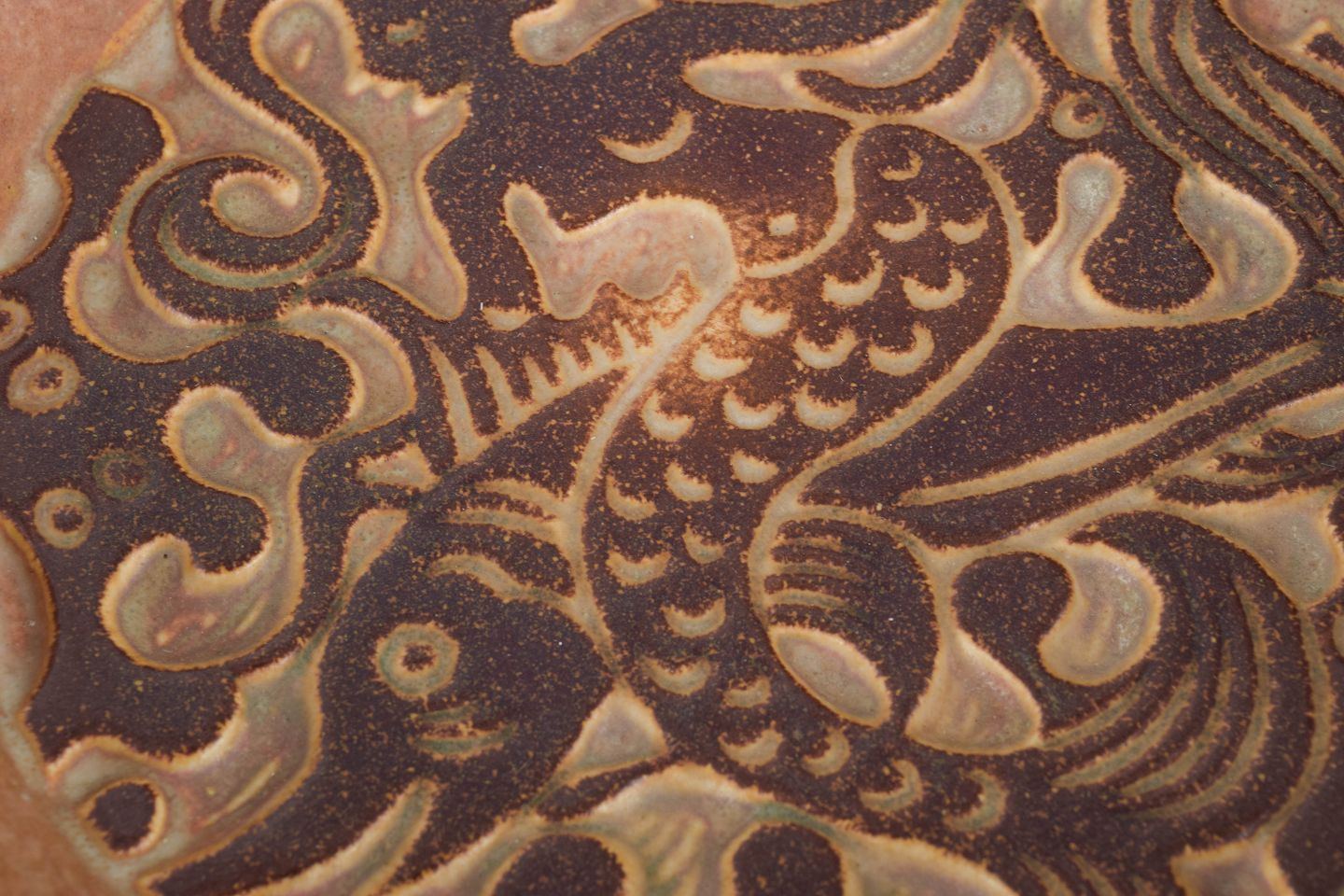Rund stentøjsskål med reliefdekoreret centrum med stiliseret fisk og organiske bølgeformer. Model 6407/2.
