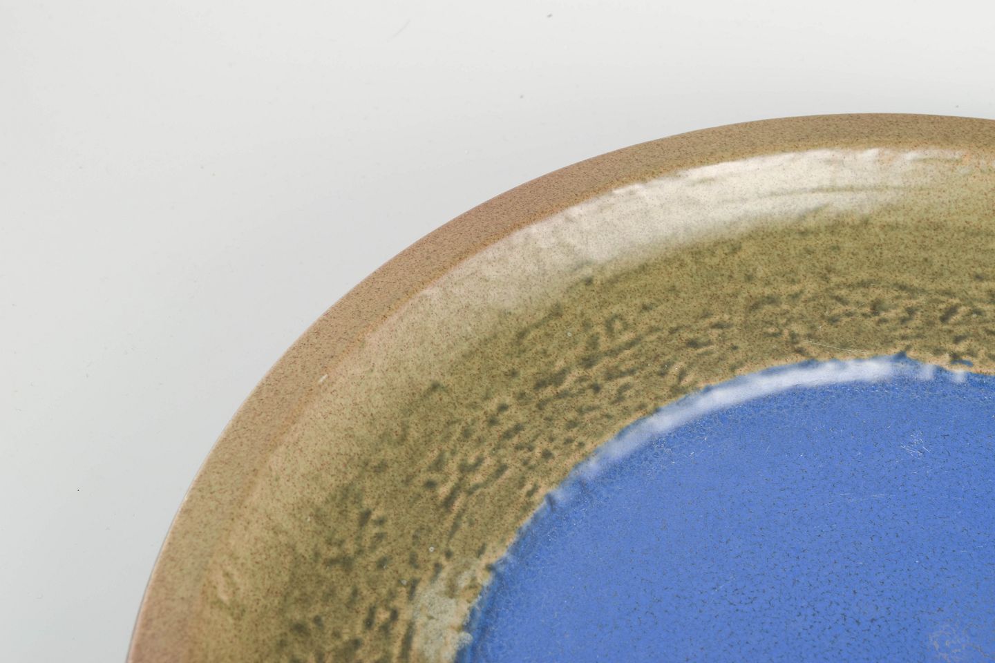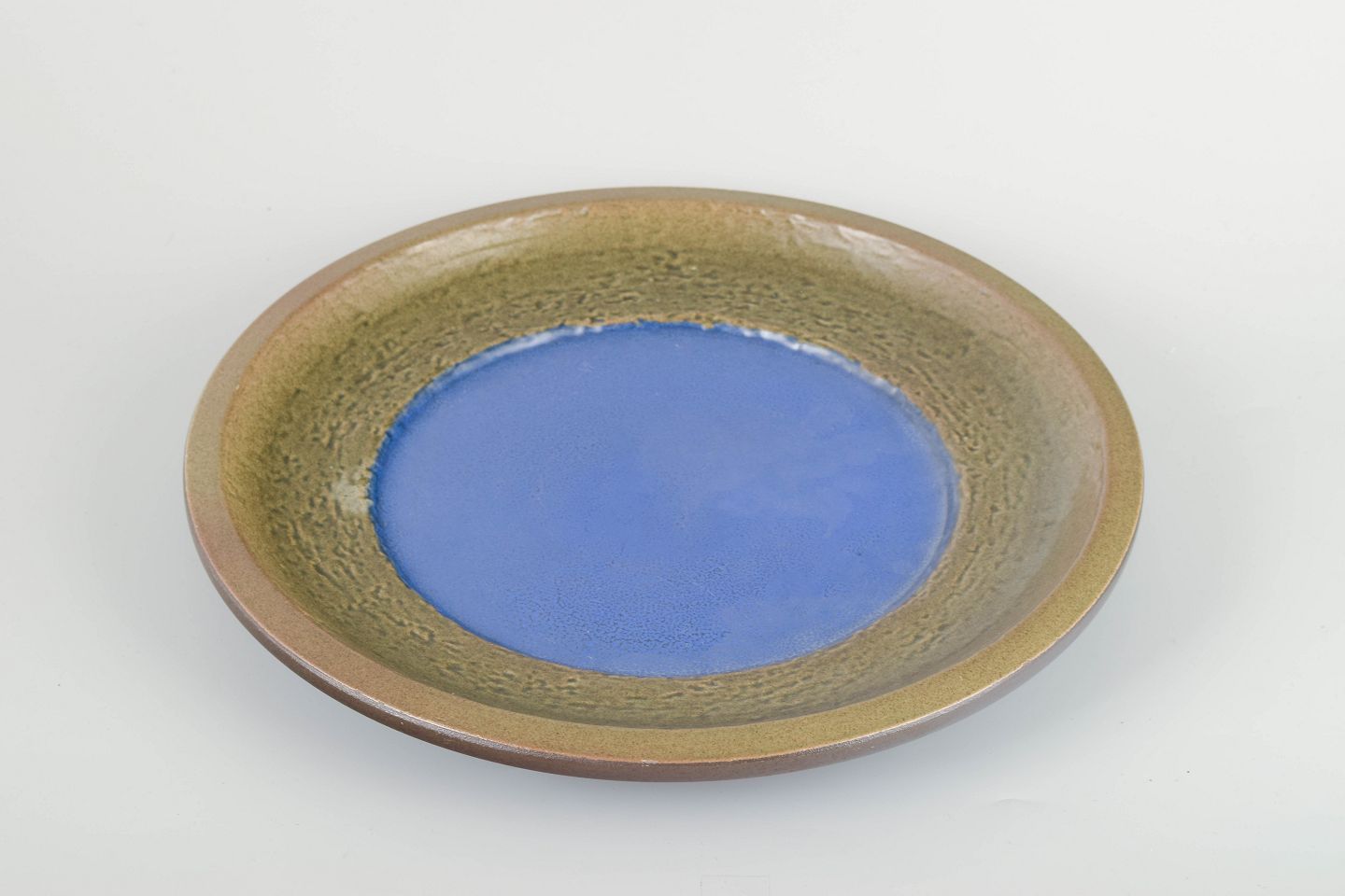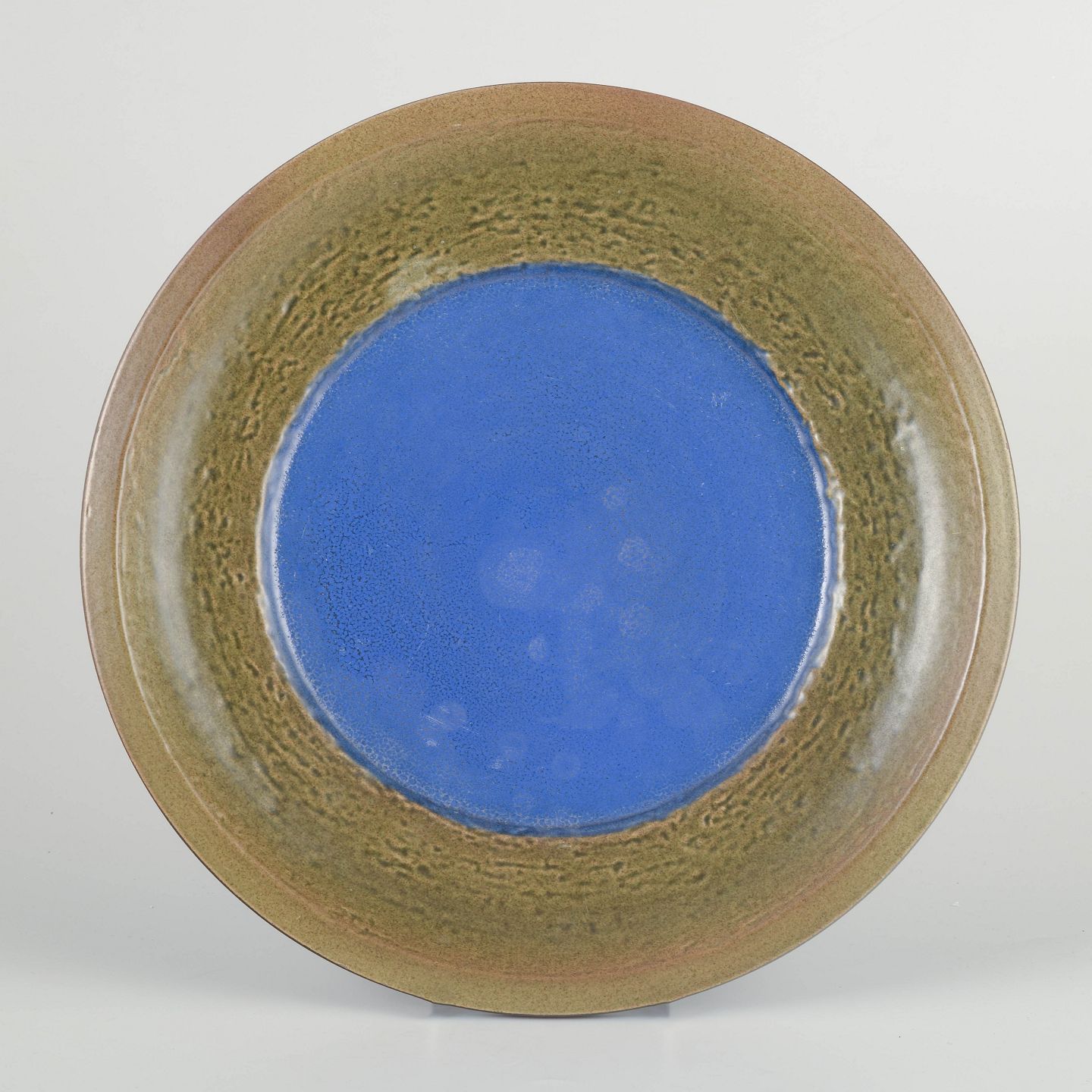 Dekorativt serverings- eller vægfad i glaseret stentøj med dyb safirblå midte og jordfarvet, let tekstureret rand i matte olivengrønne nuancer — et typisk eksempel på Upsala Ekebys moderne skandinaviske formsprog.