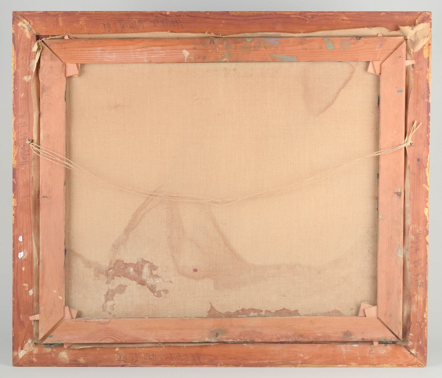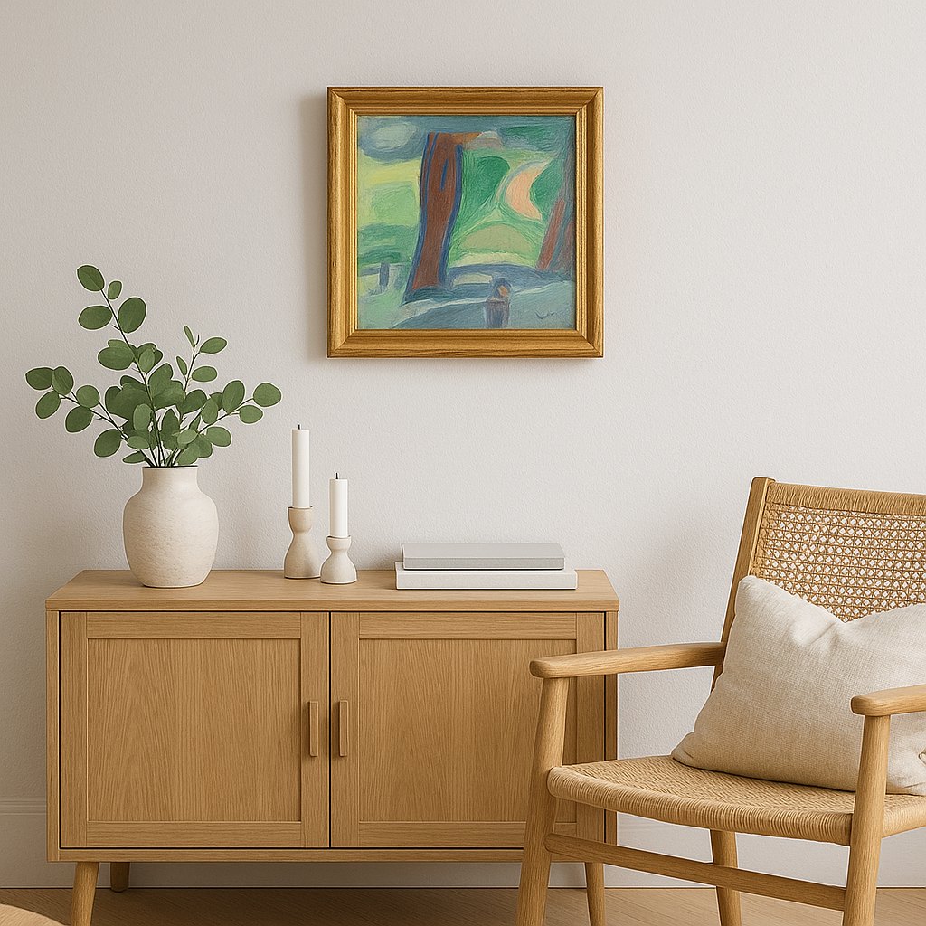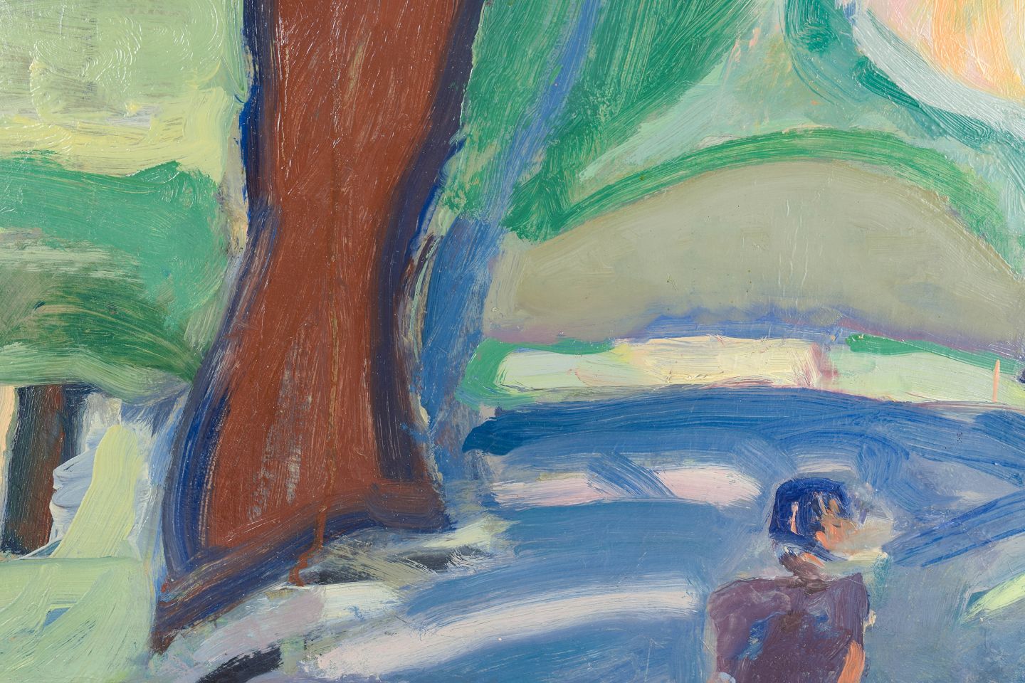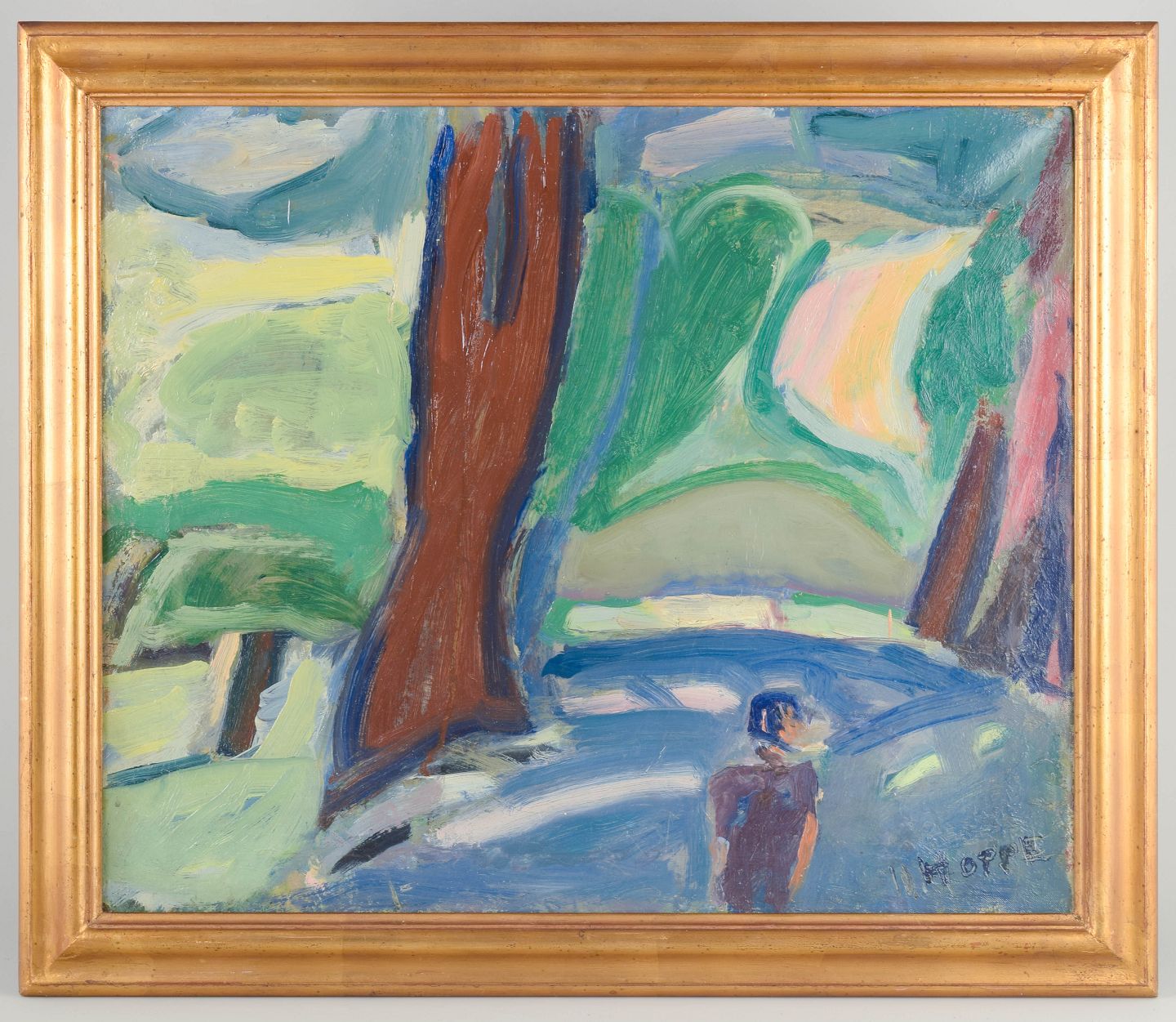 Et stemningsfuldt modernistisk landskab fra Søndermarken gengivet i Hoppe’s karakteristiske koloristiske stil med brede, pastose penselstrøg og forenklede, organiske former. Den figurative opbygning balancerer mellem det naturalistiske og det abstrakte — med den menneskelige figur diskret integreret i et poetisk blågrønt rum.
