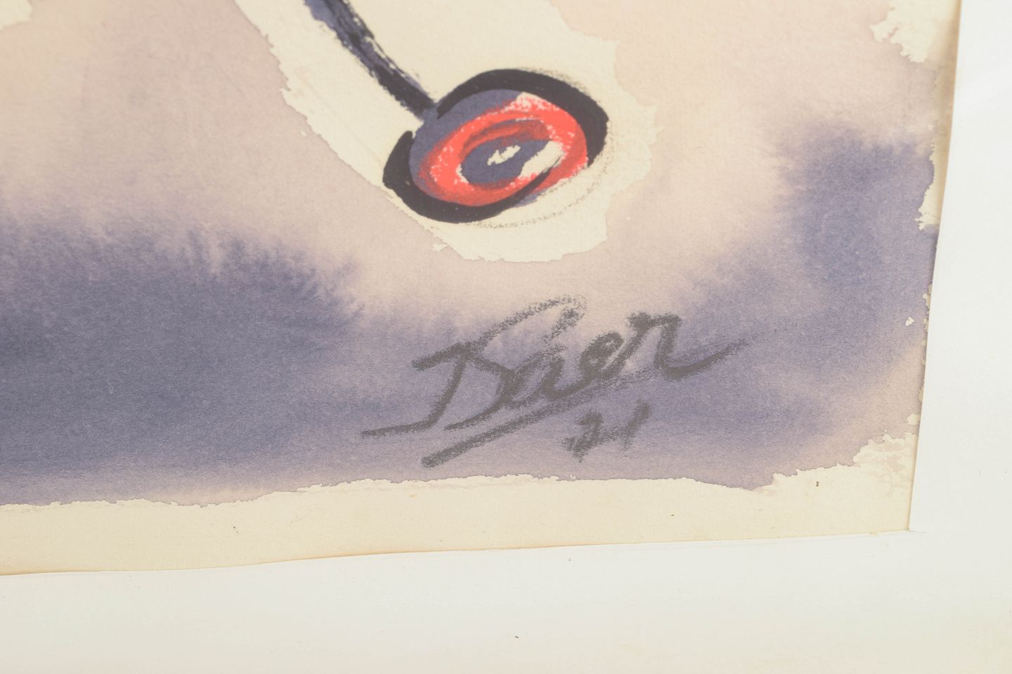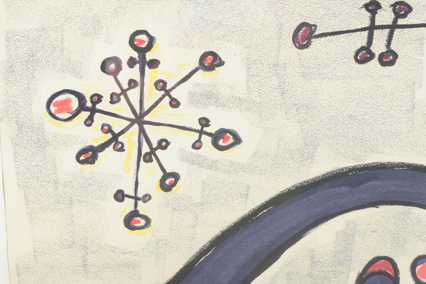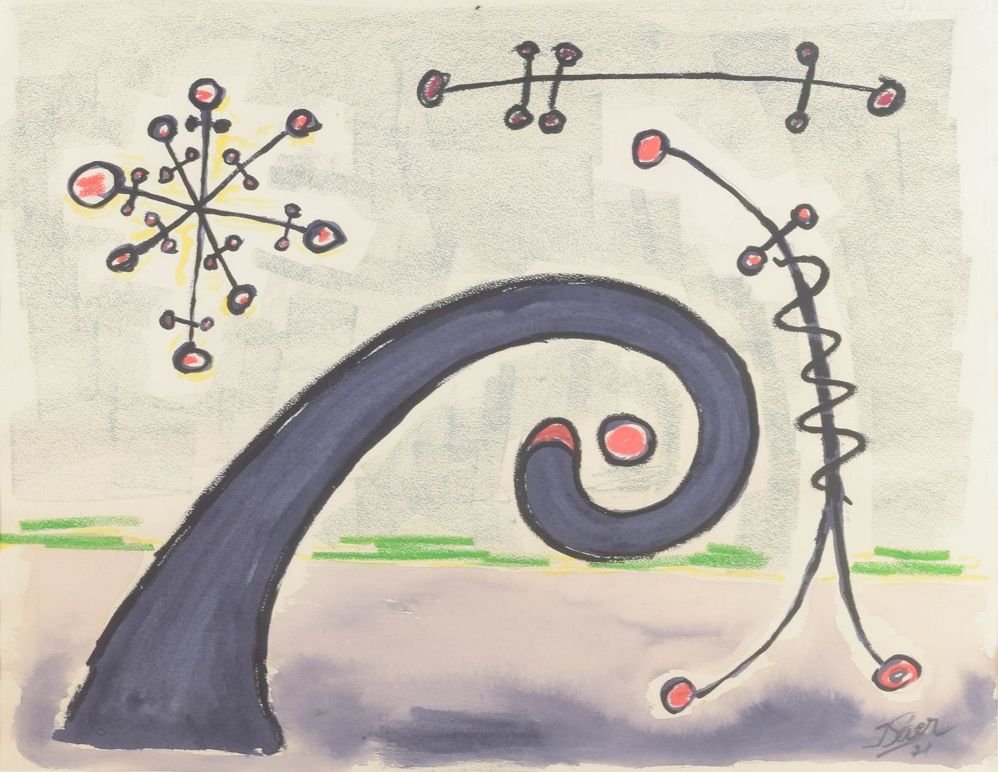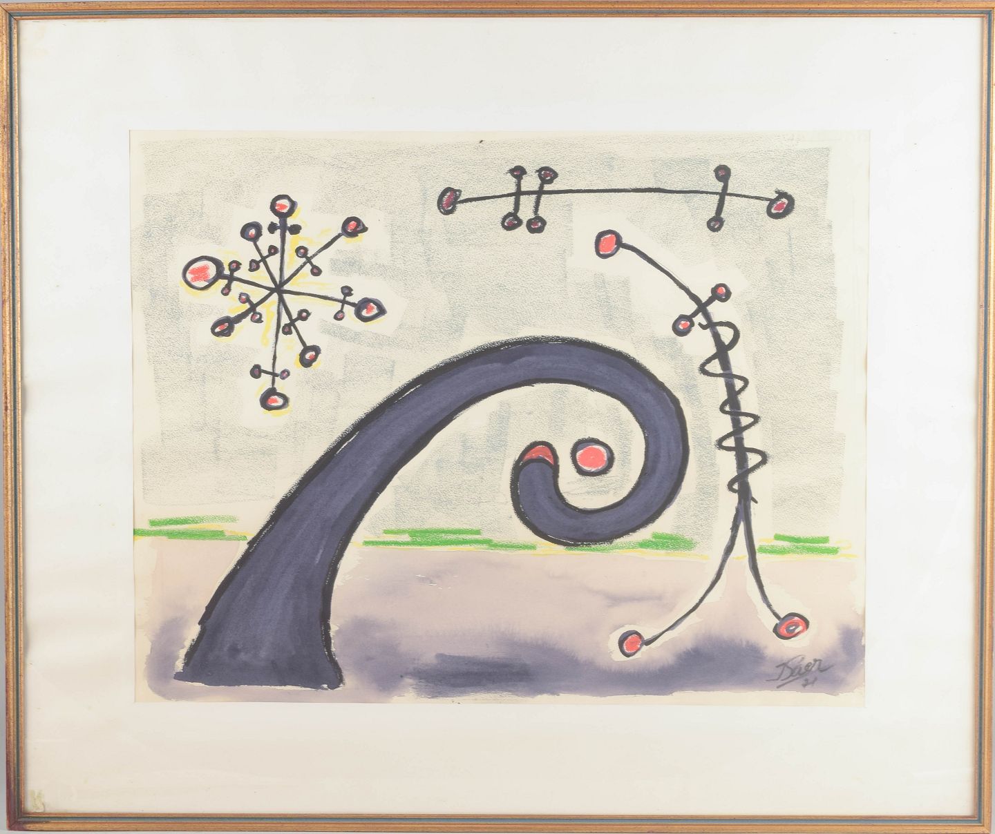 Organisk-surrealistisk komposition med svævende molekylære strukturer og spiralformede bevægelser i et drømmende, nærmest kosmisk rum. De rødlige punkter fungerer som rytmiske fikspunkter, der binder værkets grafiske elementer sammen. Let transparent akvarelteknik bag glas.