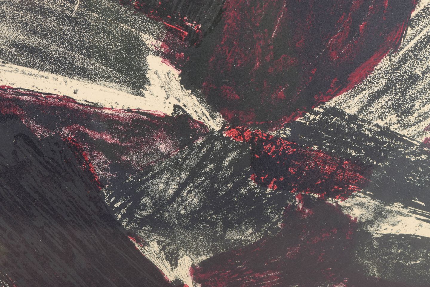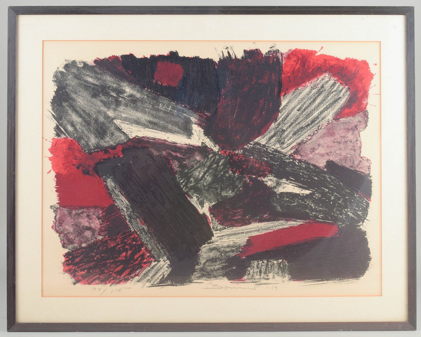 Abstrakt komposition fra 1957 med dynamiske bevægelser og kontrastfulde farvefelter, karakteristisk for Bonniers eksperimenterende tilgang til det non-figurative maleri i efterkrigstidens Sverige.