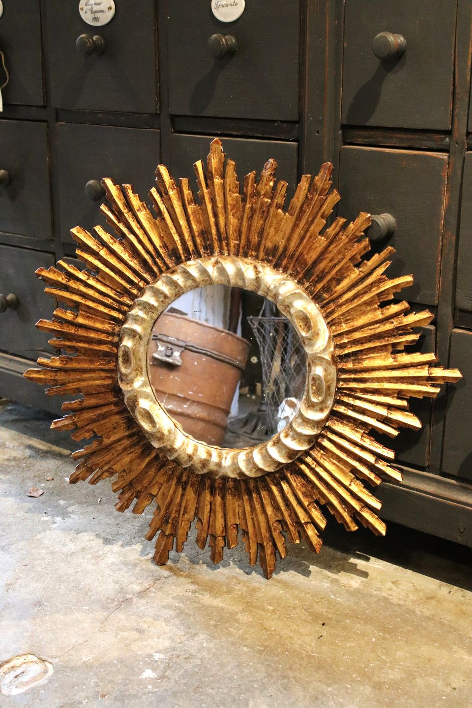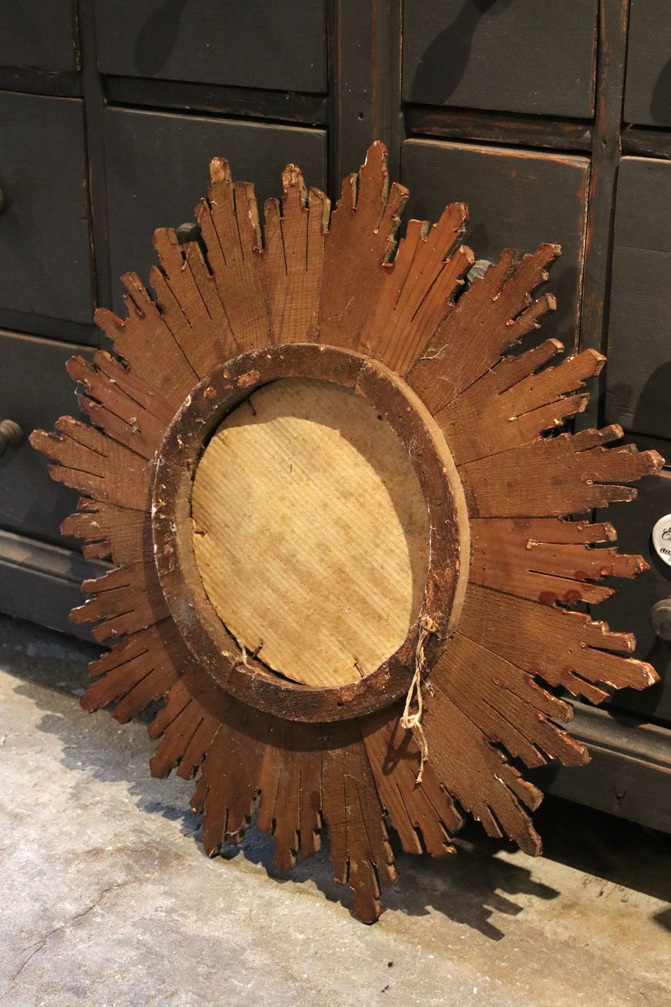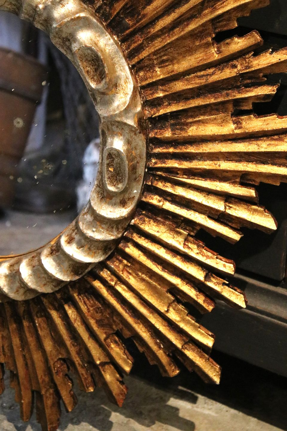 Fint , gammelt sol spejl i forgyldt / forsølvet træ med originalt gammelt spejlglas og en rigtig fin patina. Dia.: 66cm. Spejl Dia.: 24cm. Udstiller