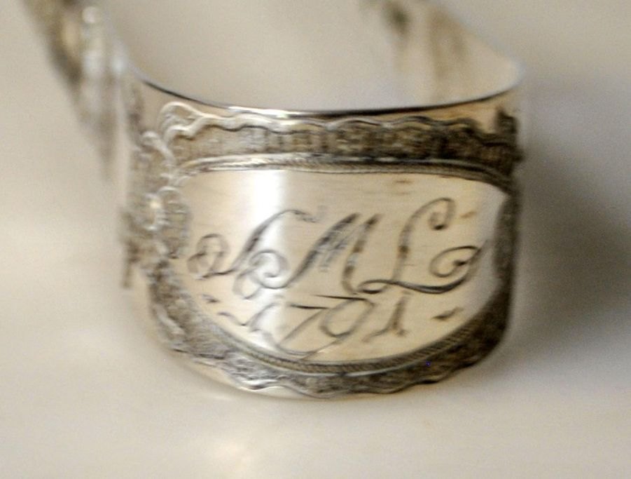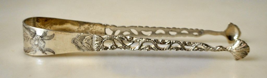 Rokoko-Zuckerzange aus Silber, 1791. Dänemark. Unklarer Meisterstempel: FQ. L.: 15,5 cm. Mit Gravur: SLM 1791.Perfekter Zustand!