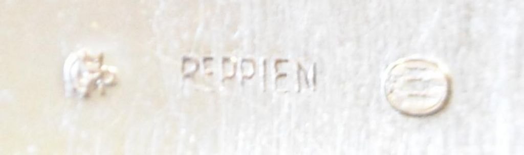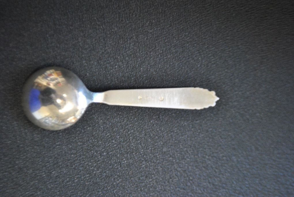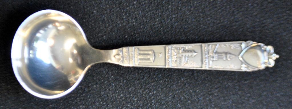 Reppien-Gedenklöffel, 1954, Skanderborg, Dänemark. Griff mit Darstellungen von: Himmelbjerget, Skanderborg-Schlosskirche und Ejer Bavnehøj. Gestempelt. L.: 14,5 cm. Gewicht: 24 Gramm.Perfekter Zustand!
