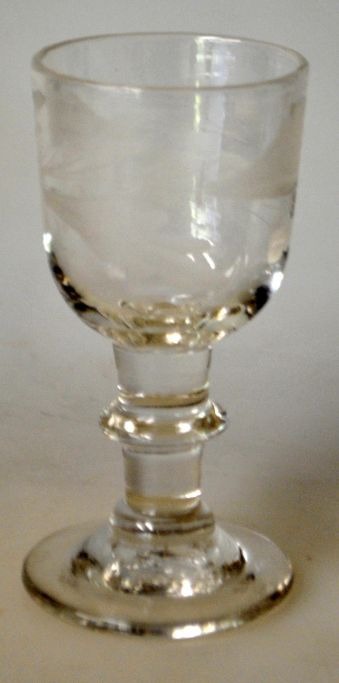 Schnapsglas mit Eichenblattschliff, Dänemark, 19. Jahrhundert. Stiel mit Knopf. Schliff mit 4 Blättern und 8 Eicheln oben und unten. H.: 8 cm.Bestellnummer: 28266
