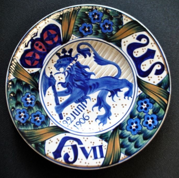 Aluminia-Fayence 481/352 Teller. Dänemark. 7. Krönungsteller von Königin Maud und König Haakon 1906. Durchmesser: 25 cm<br /> Haakon VII. (3. August 1872 – 21. September 1957) war von 1905 bis 1957 König von Norwegen und wurde nach der Auflösung der Union mit Schweden im Jahr 1905 per Referendum gewählt. Am 22. Juni 1906 wurden Maud und Haakon im Nidarosdom in Trondheim gekrönt.Bestellnummer: 28268