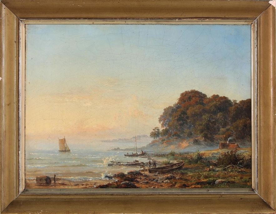 Kiærschou, Frederik Christian (1805 - 1891) Dänemark: Die Fischer kehren vom Meer heim. Die Fischer kehren vom Meer heim. Öl auf Leinwand. Sehr schwach signiert.Gerahmt: 33,5 x 43 cm. In einem antiken Silberrahmen.