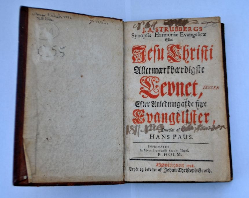 J. A. Strubbergs: Das bemerkenswerte Leben Jesu Christi, basierend auf den vier Evangelien. Übersetzt von Hans Paus. Gedruckt in Kopenhagen 1748. Vollledereinband. Mit Golddruck auf dem Rücken.