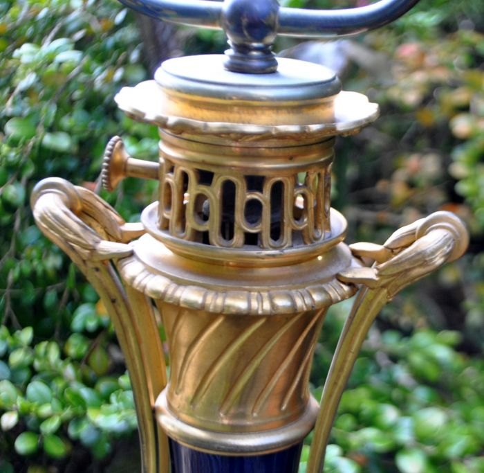 Französische Tischlampe, 19. Jahrhundert. Ehemalige Petroleumlampe, umgebaut auf elektrisch. Vergoldete Bronze, Korpus aus blauem Porzellan. Mit wunderschönen Engelsverzierungen. H.: 65 cm.Bestellnummer: 28445