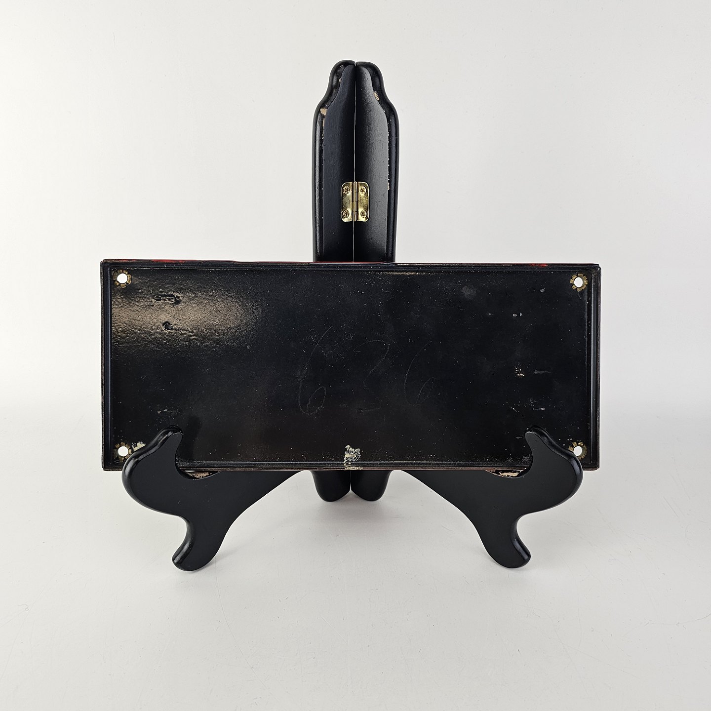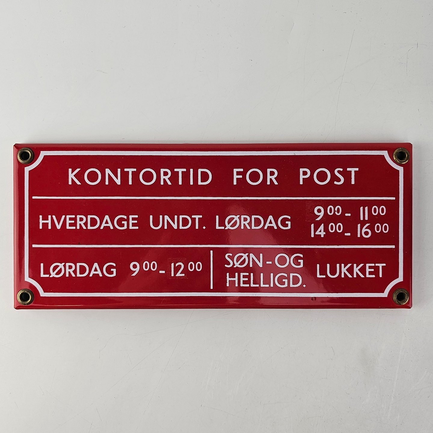 Rødt emaljeskilt med teksten Kontortid for post og åbningstiderProducent Ukendt