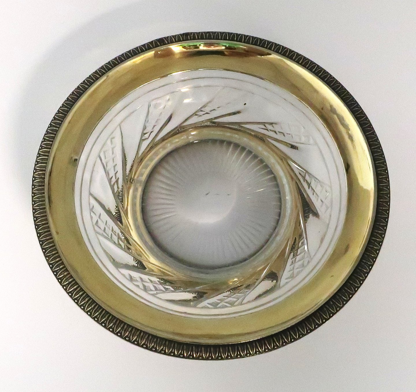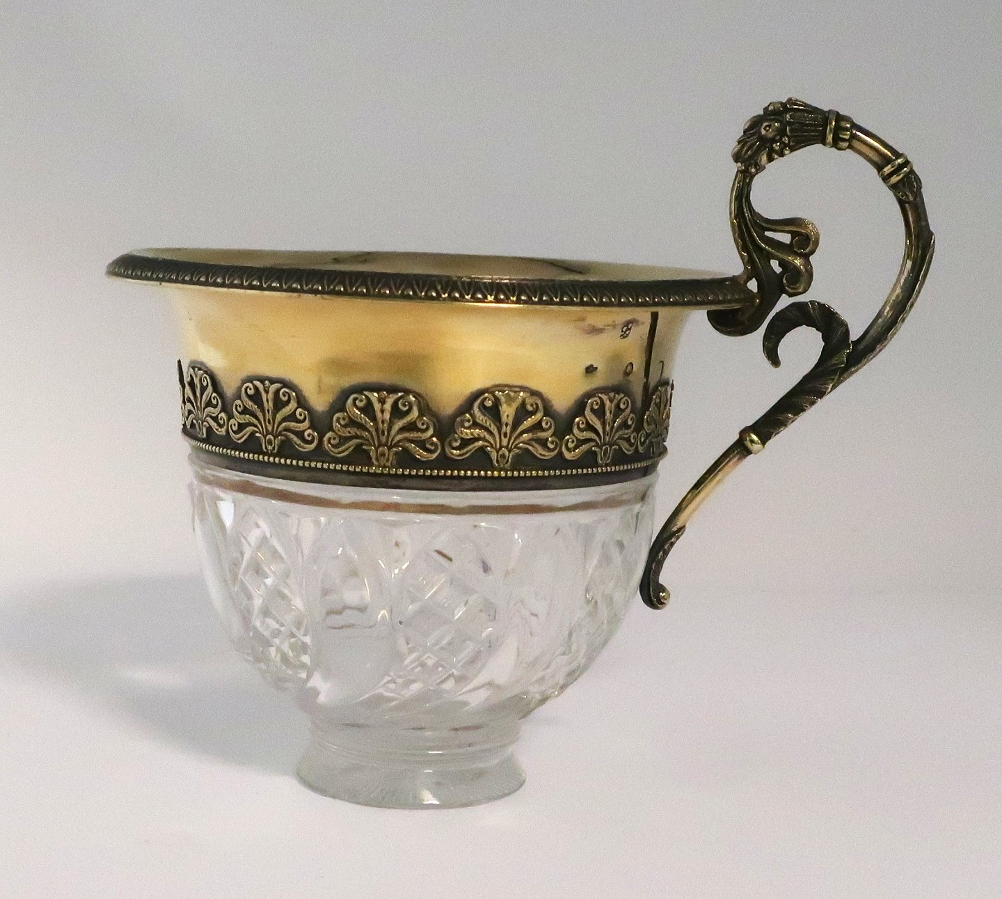 Französische Kristalltasse mit vergoldeter Silbermontierung. Tasse und Untertasse. Höhe 13 cm. Kleiner Stoss an der Tassenunterseite. Händler