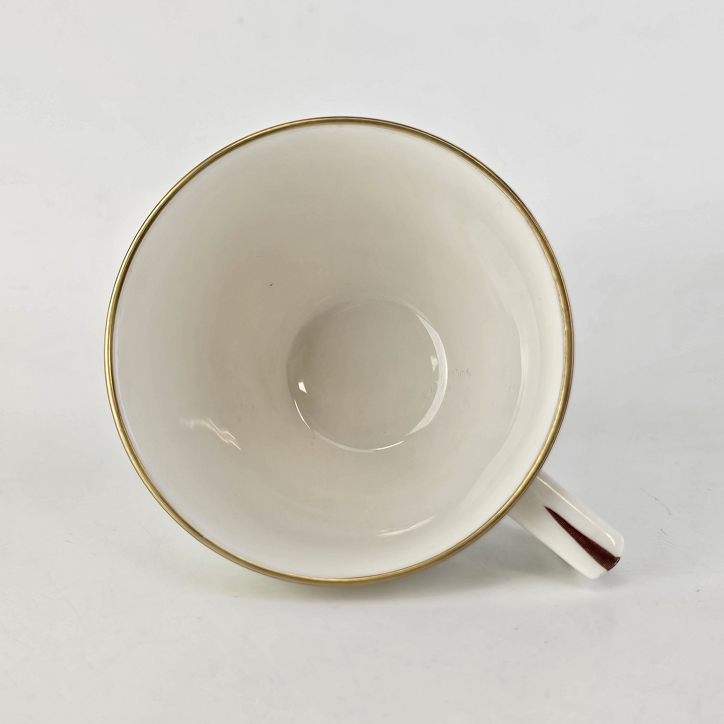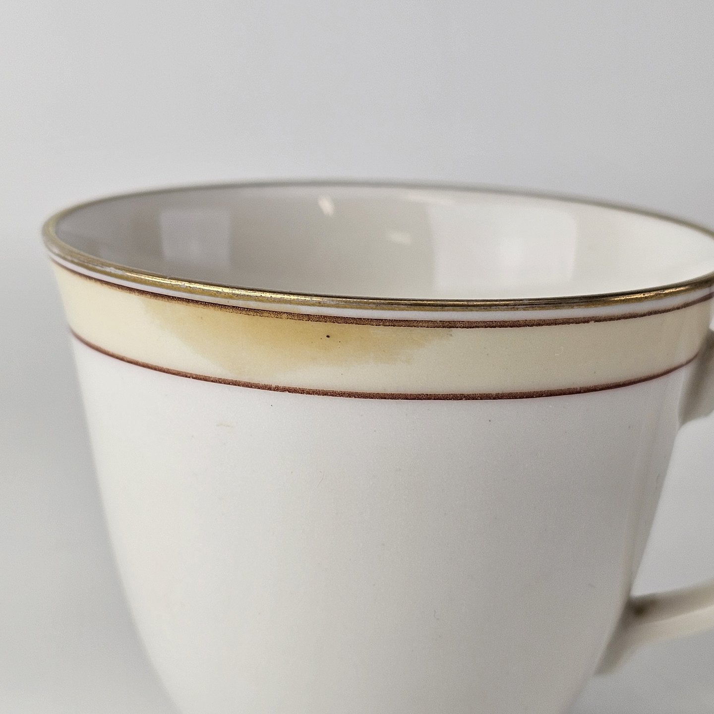Service i glat hvidt porcelæn pyntet med dekoration i beige, brændt orange og gylden streg.