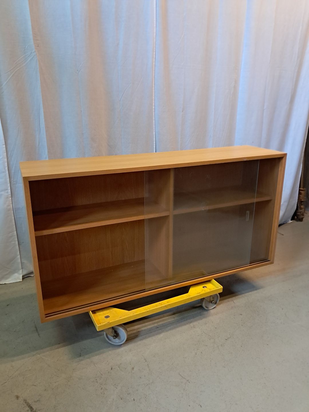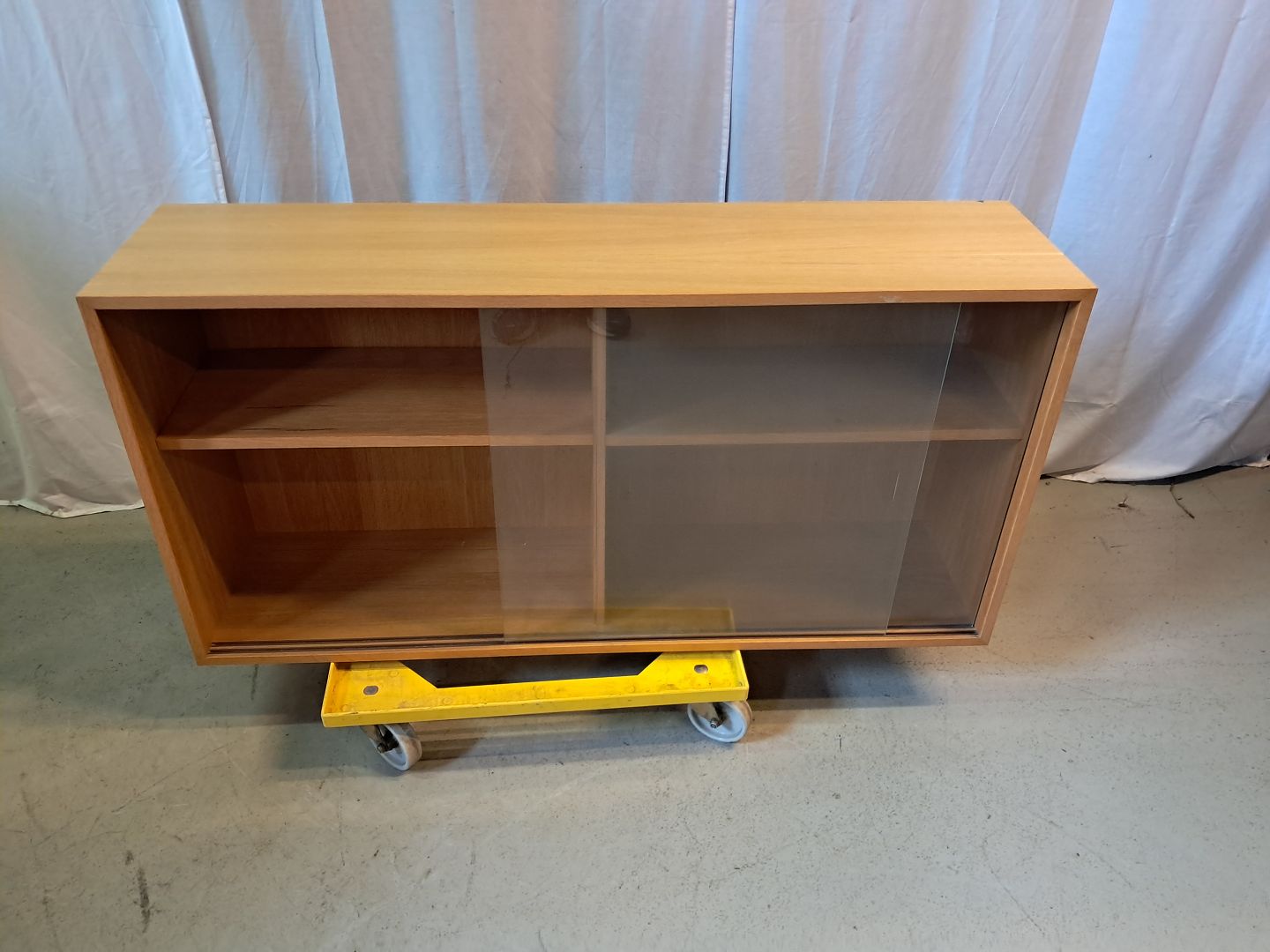 Reol i fineret egetræ med glaslåger, fra 1990erne.Den har brugsspor og der medfølger ikke ophæng.