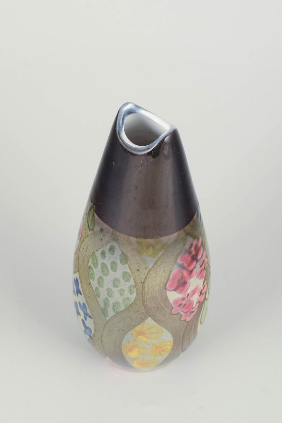 Hånddekoreret stentøjsvase med karakteristisk organisk form og farverig blomsterdekoration i blå, rosa, gul og grøn — fra serien “Mimosa”, designet af Ingrid Atterberg for Upsala Ekeby i 1960’erne.