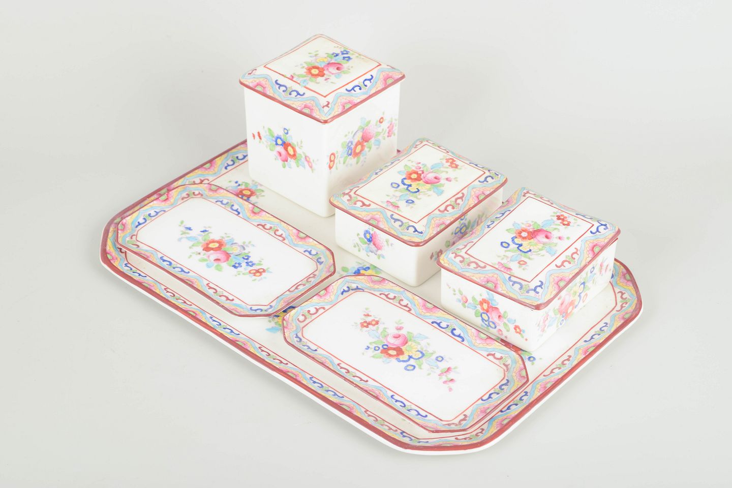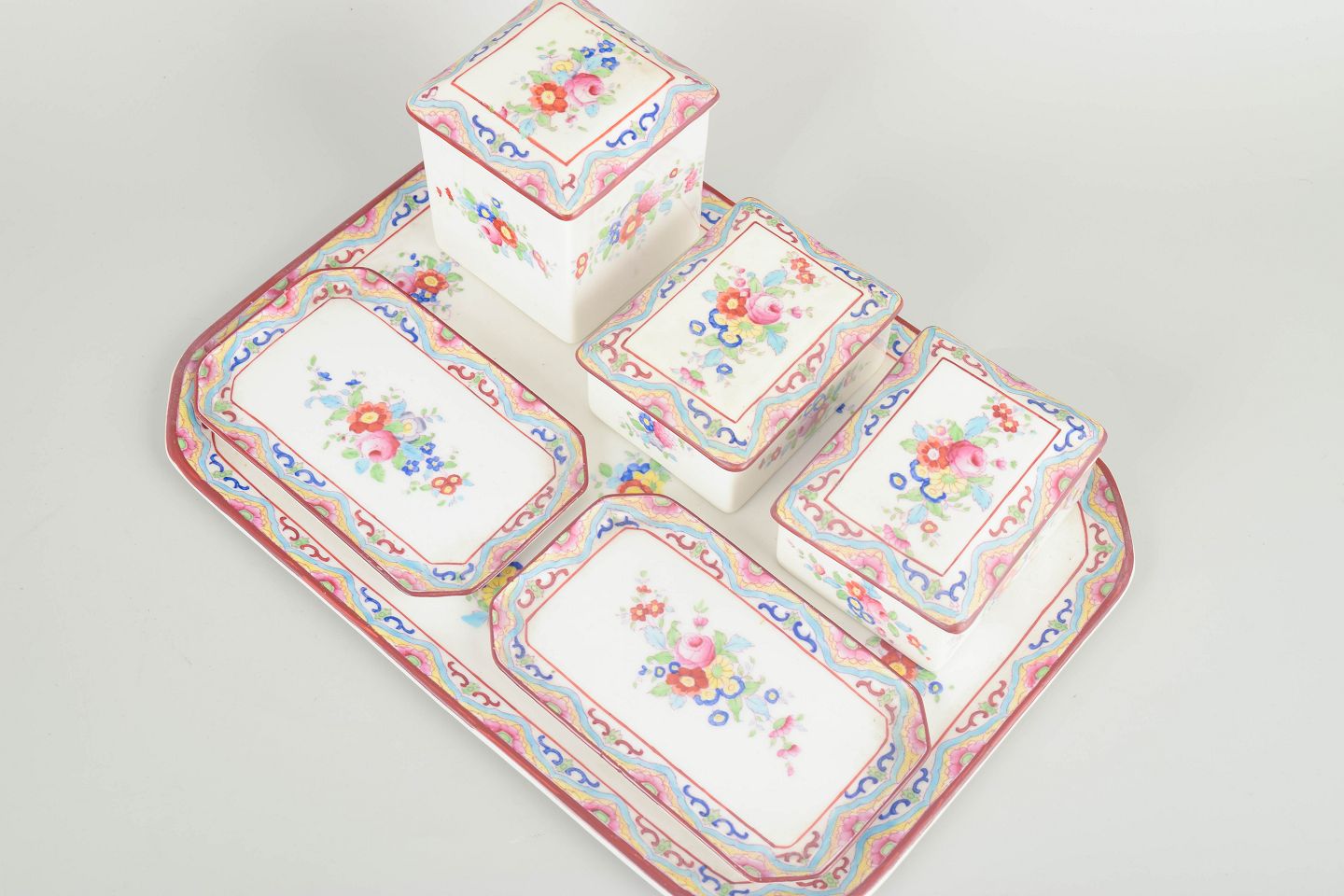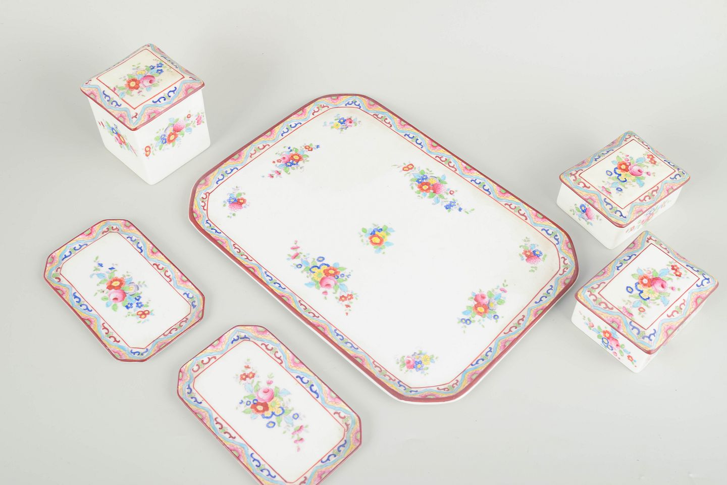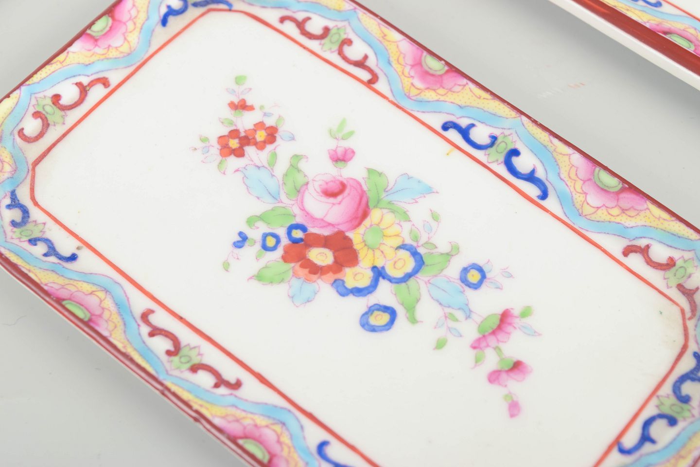 Hvidt porcelæn dekoreret med polykrome blomster og karakteristisk bølgende bånd i art-deco / chinoiserie-stil — ofte refereret til som “Peacock”-mønster.