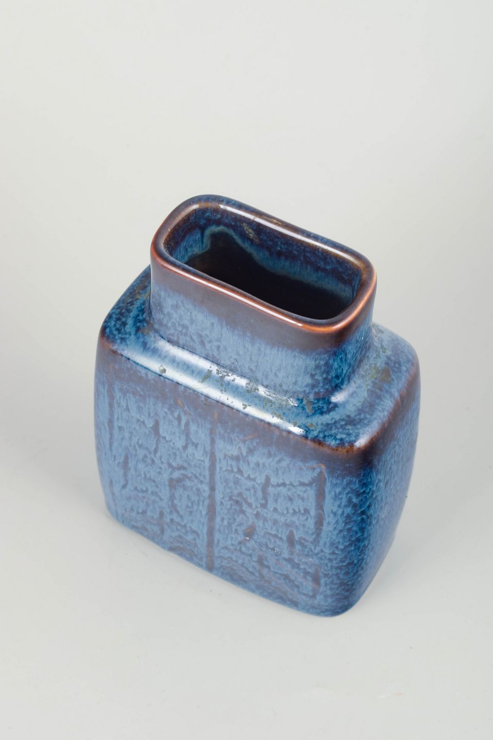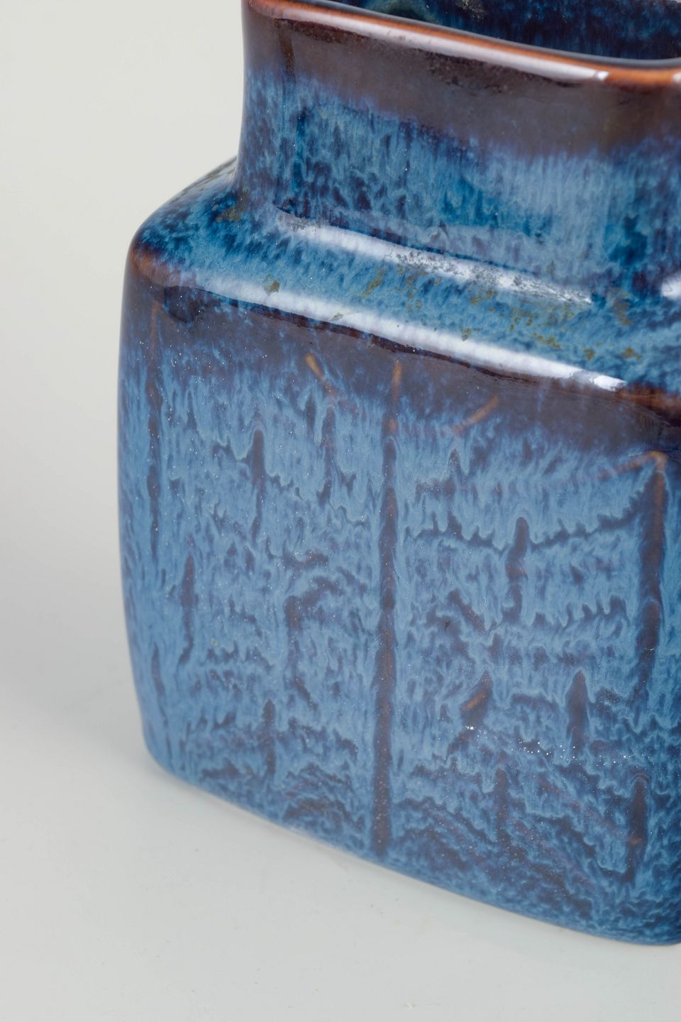 Rektangulær stentøjsvase med blød afrundet form og dyb blå løbende glasur med brun kantning mod åbningen.