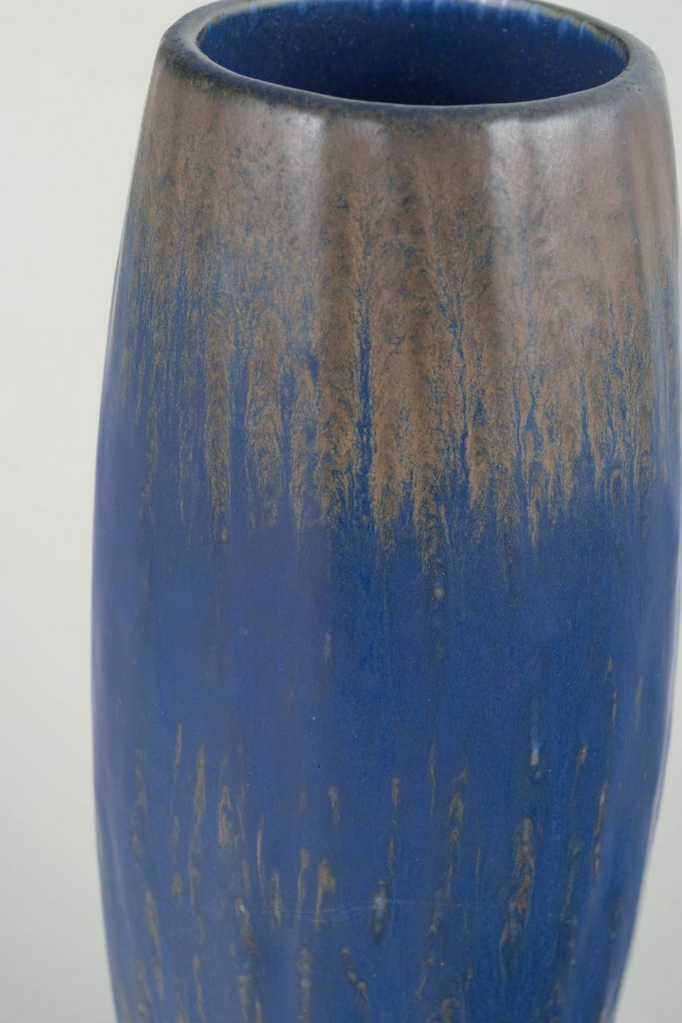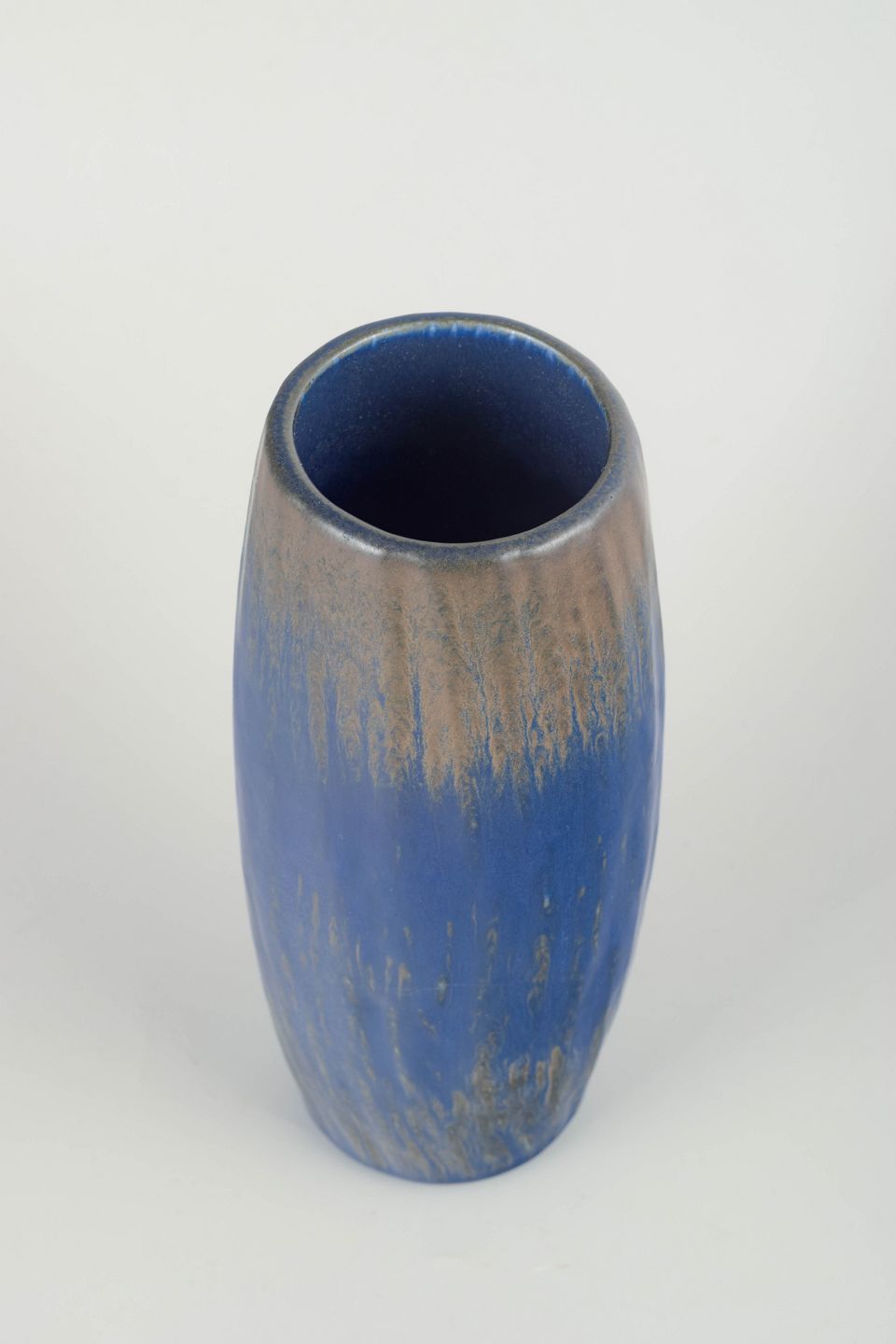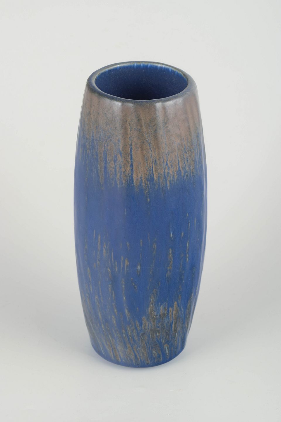 Høj cylindrisk stentøjsvase med organisk let tilspidset form og dyb koboltblå mat glasur med brunlig løbende effekt mod kant og bund.