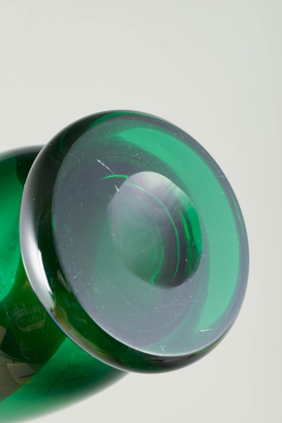 Mundblæst skandinavisk studioglas med tonegradueret farveskift fra blå til grøn. Stor skulpturel dobbeltbalusterform med slank hals.