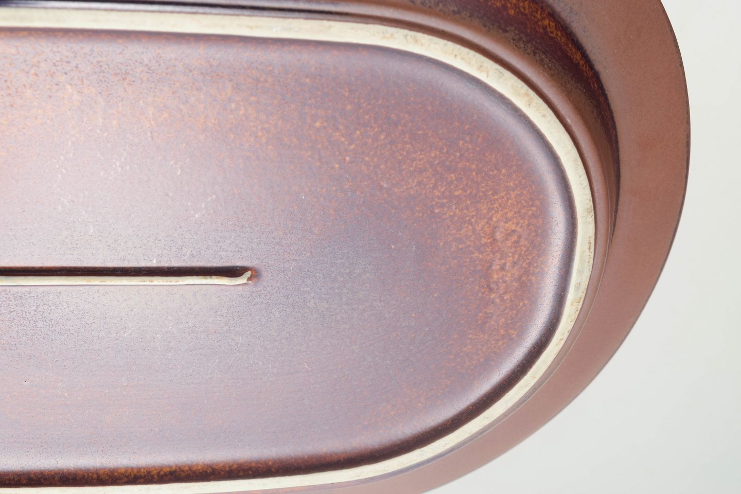 Blødt afrundet oval form dækket af varm brun Ruska-glasur med levende nuancer og karakteristisk melering i overfladen.