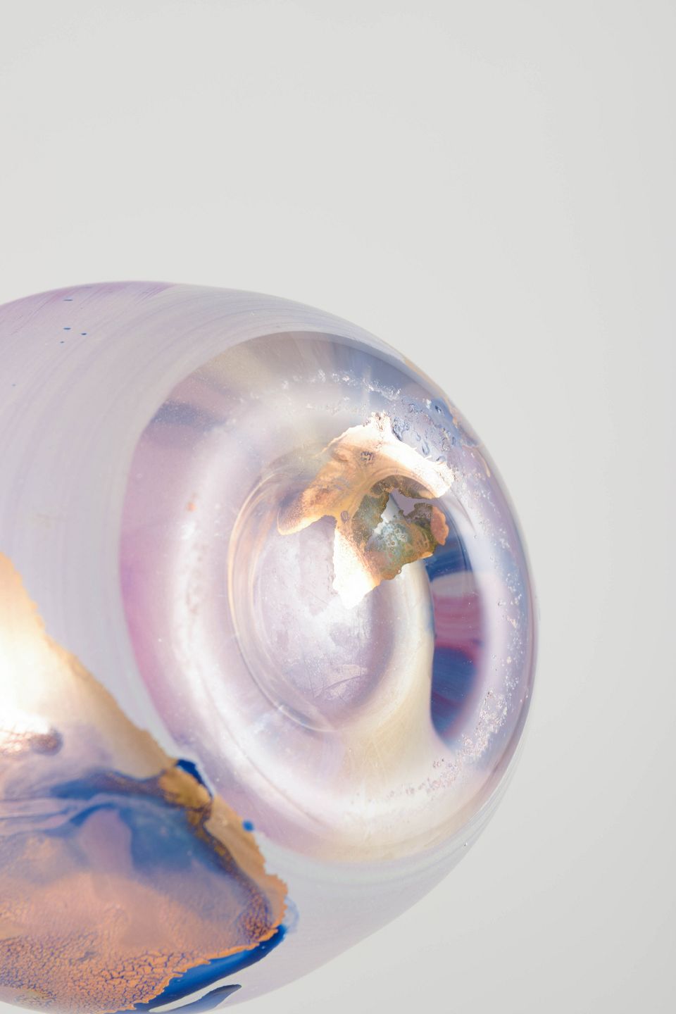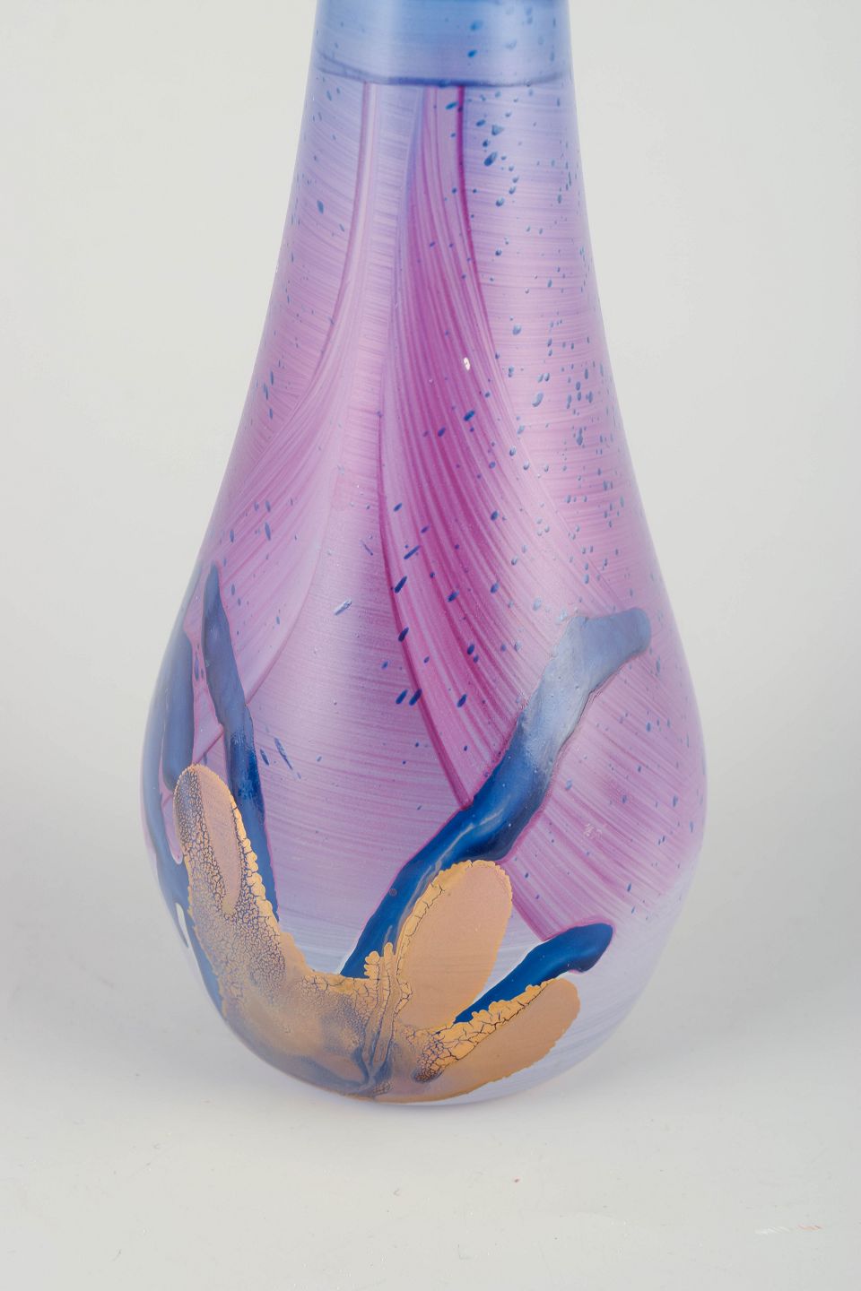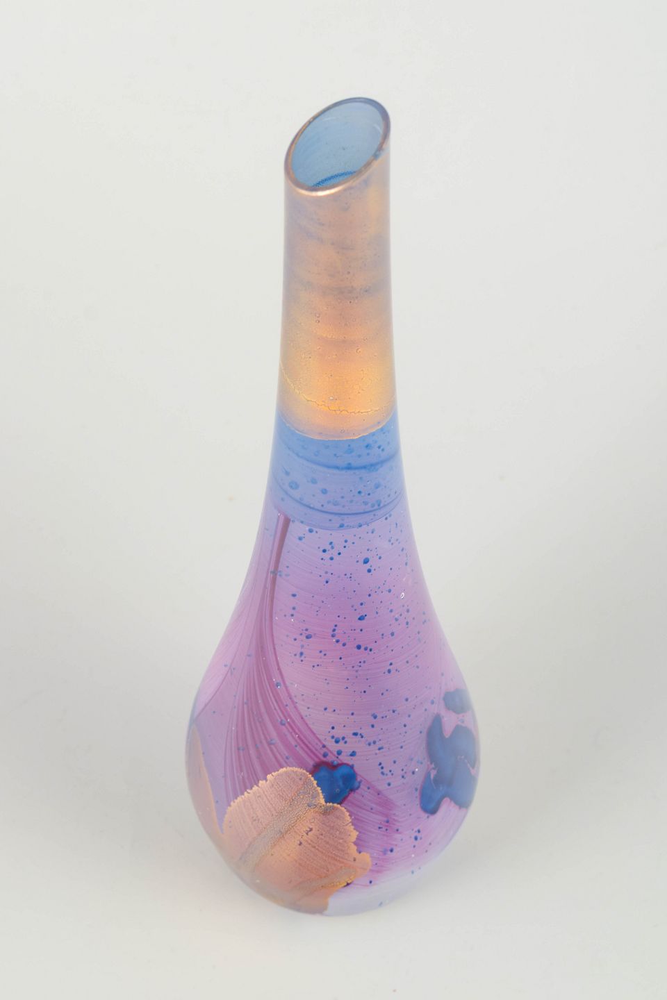 Fransk studioglasvase, 1980’erne.Elegant slank art-glass vase i mundblæst glas med iriserende overflade i pastelrosa, blå og gyldne toner samt indfangede organiske farveelementer.