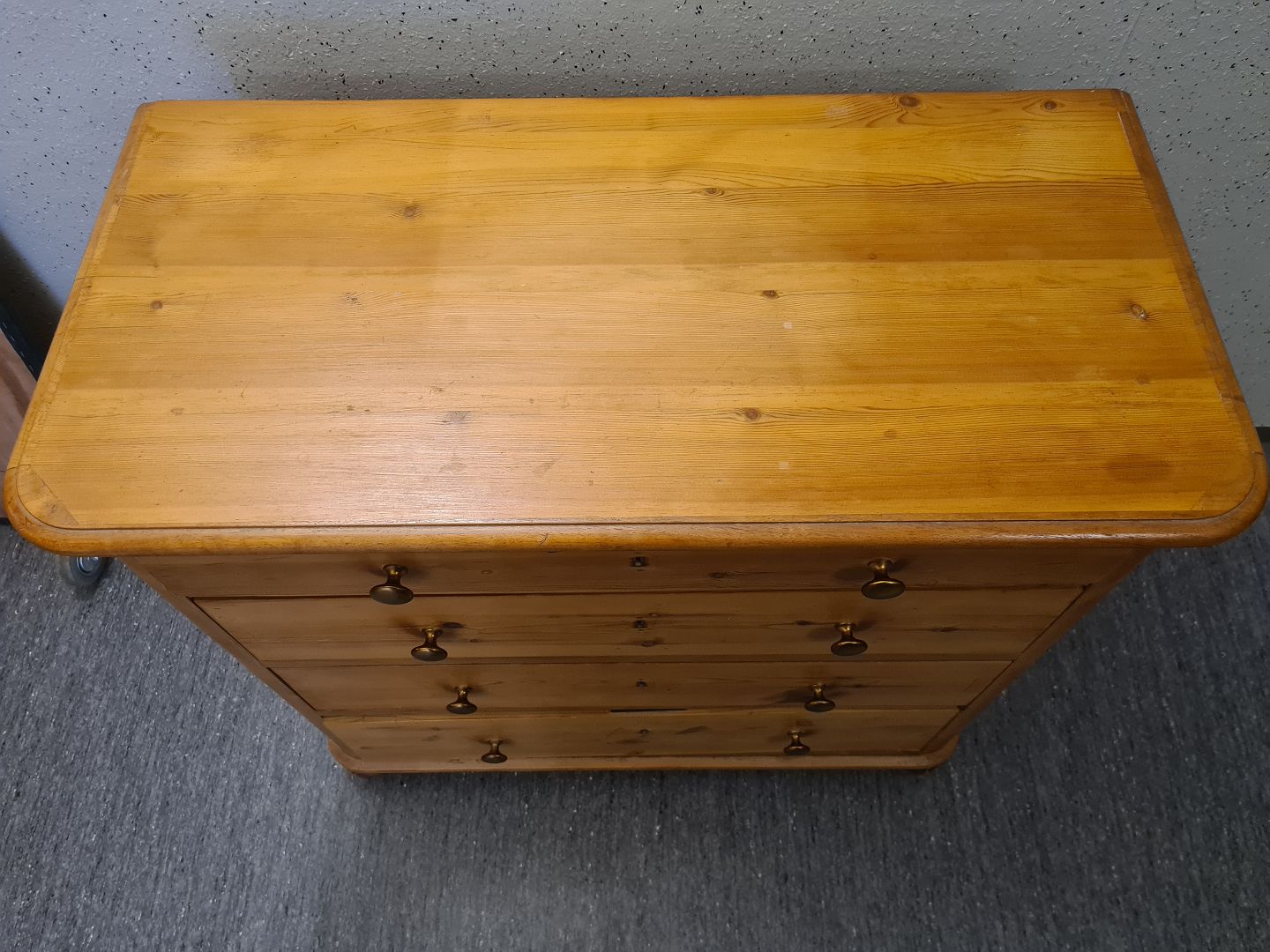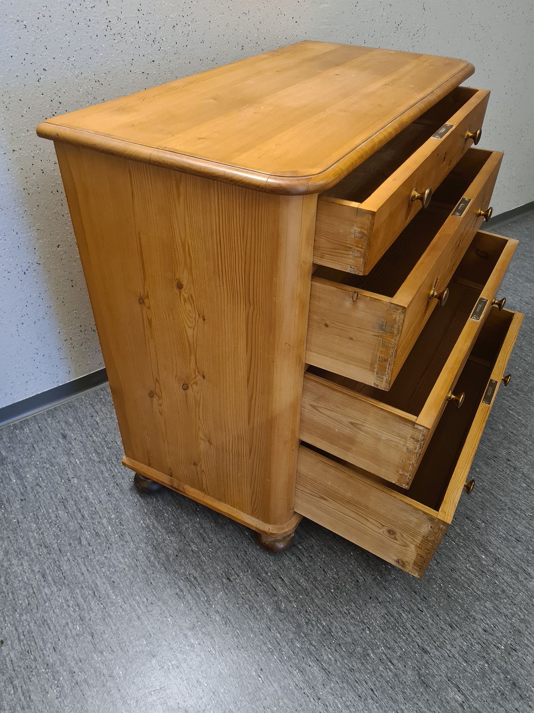 Kommode fra 1940'erne I massiv fyrretræ. Fremstår pæn, velholdt og udmærket funktionsdygtig. Dog med ganske få brugsspor på toppen (billede) og umiddelbart uden nøgle.Højde 88 cm. Bredde 94 cm. Dybde 46 cm.