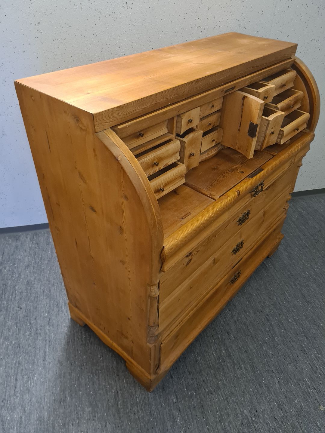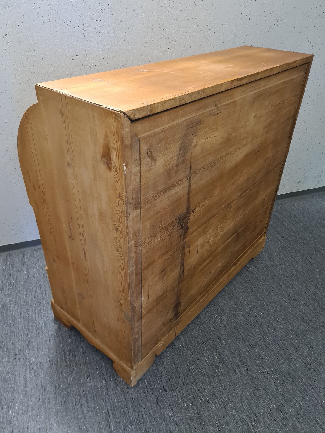 Chatol fra 1930'erne i massiv fyrretræ. Fremstår pænt, ok velholdt og udmærket funktionsdygtigt uden de store brugsspor. Dog umiddelbart uden nøgle.Højde 115 cm. Bredde 118 cm. Dybde 54 cm.
