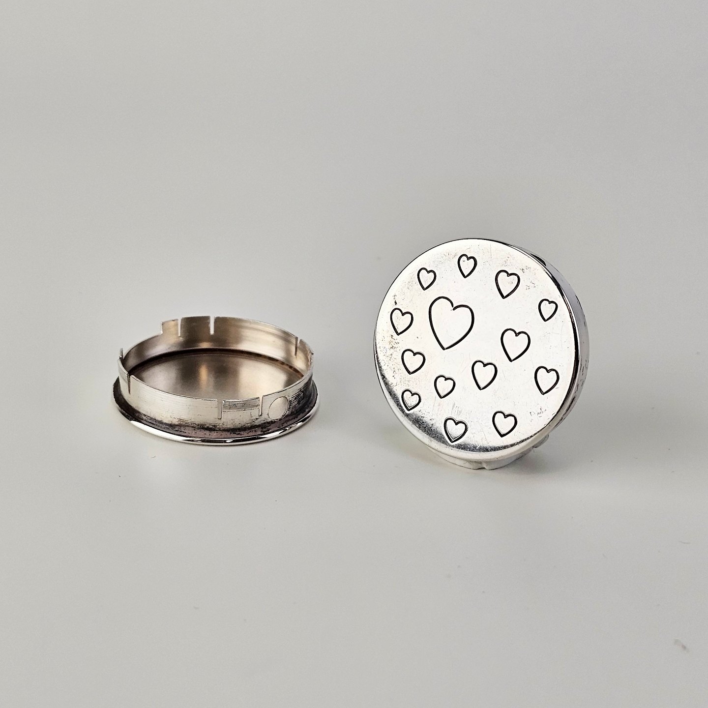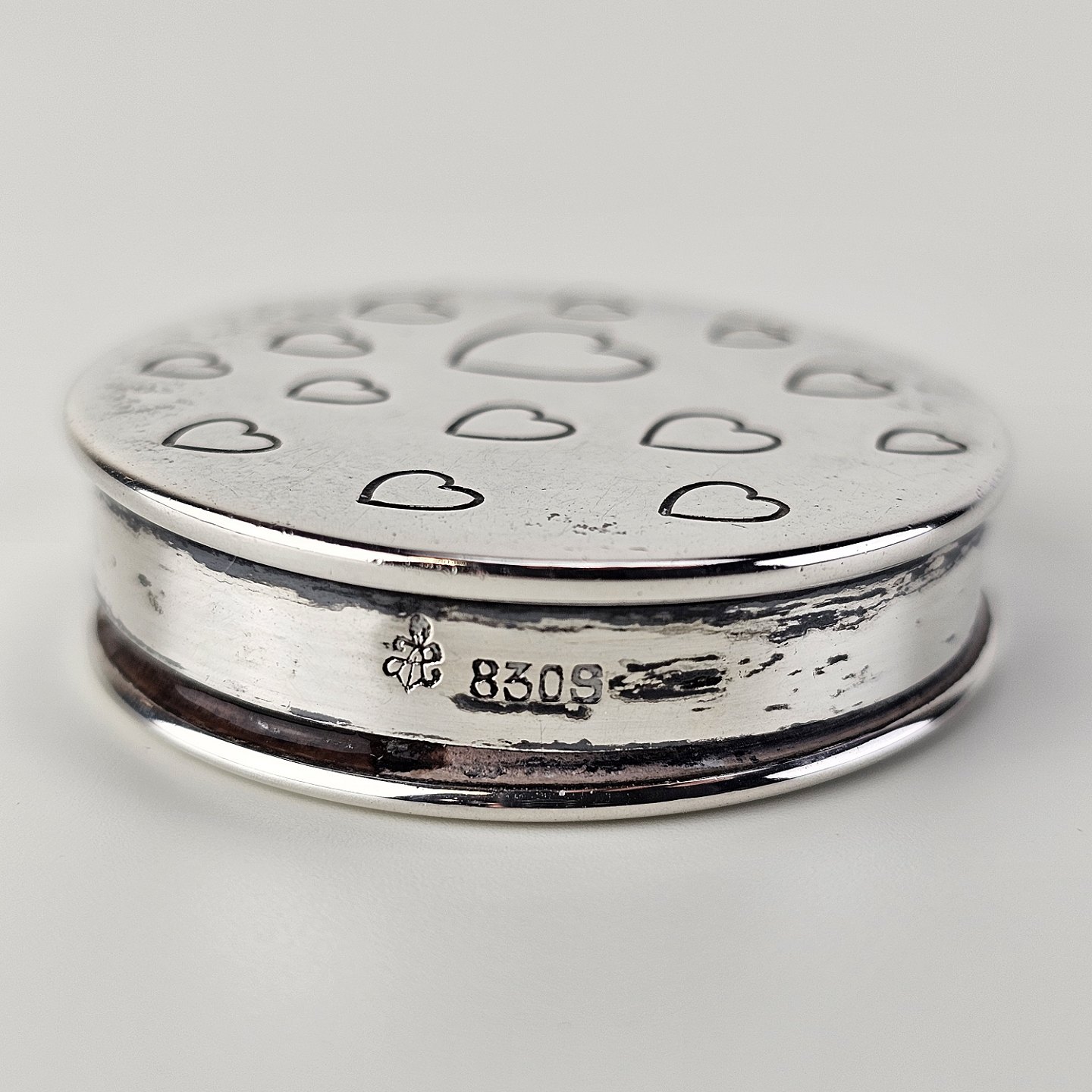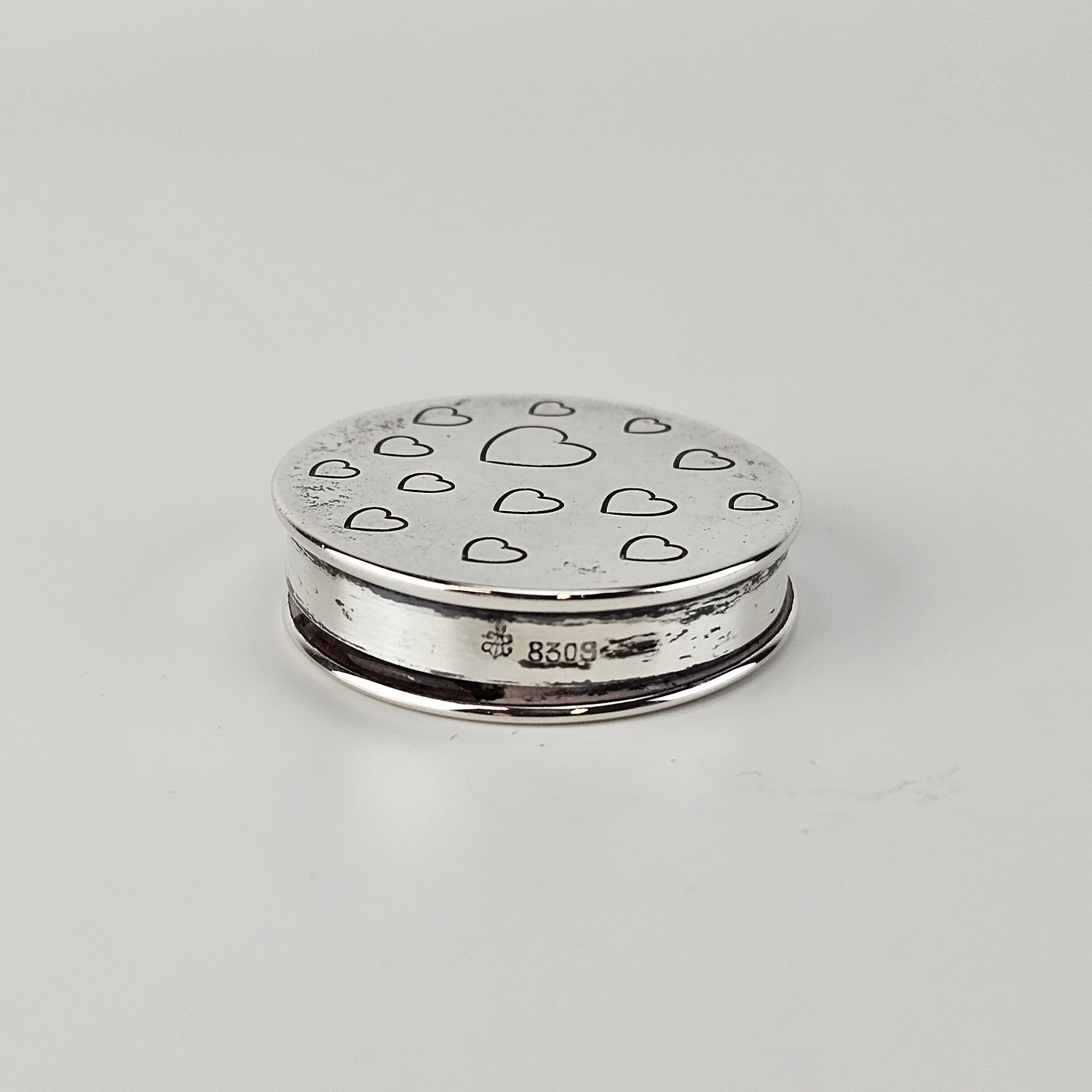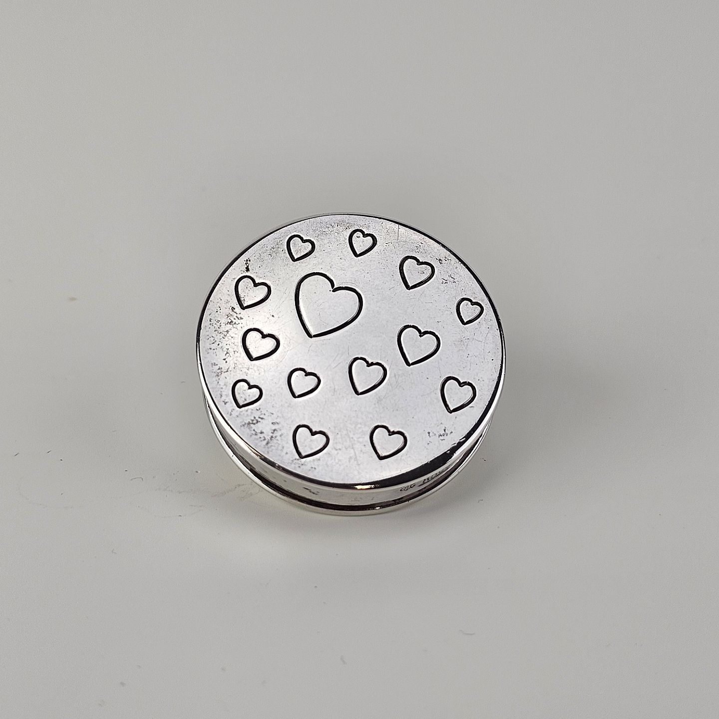 Rund pilleæske i 830 sølv med motiv af indgraverede hjerterStemplet 830S