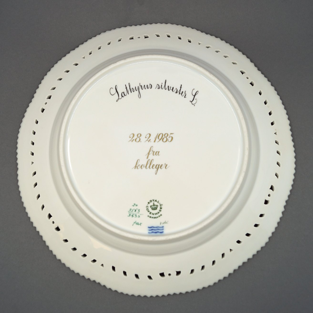 oyal Copenhagen, Flora Danica porcelæn; Middagstallerken #3553/3535 med gennembrudt kant.Dekoration: Lathyrus silvester L. (Skov-ærteblomst). Dekoreret i farver og guld med blomster.