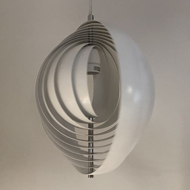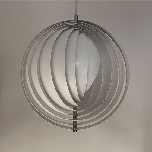 Verner Panton Pendel (The Moonlamp) udført af hvidlakeret metal. Formgivet i 1960, fremstillet hos Frandsen Lighting. Fremstår i rigtig flot stand