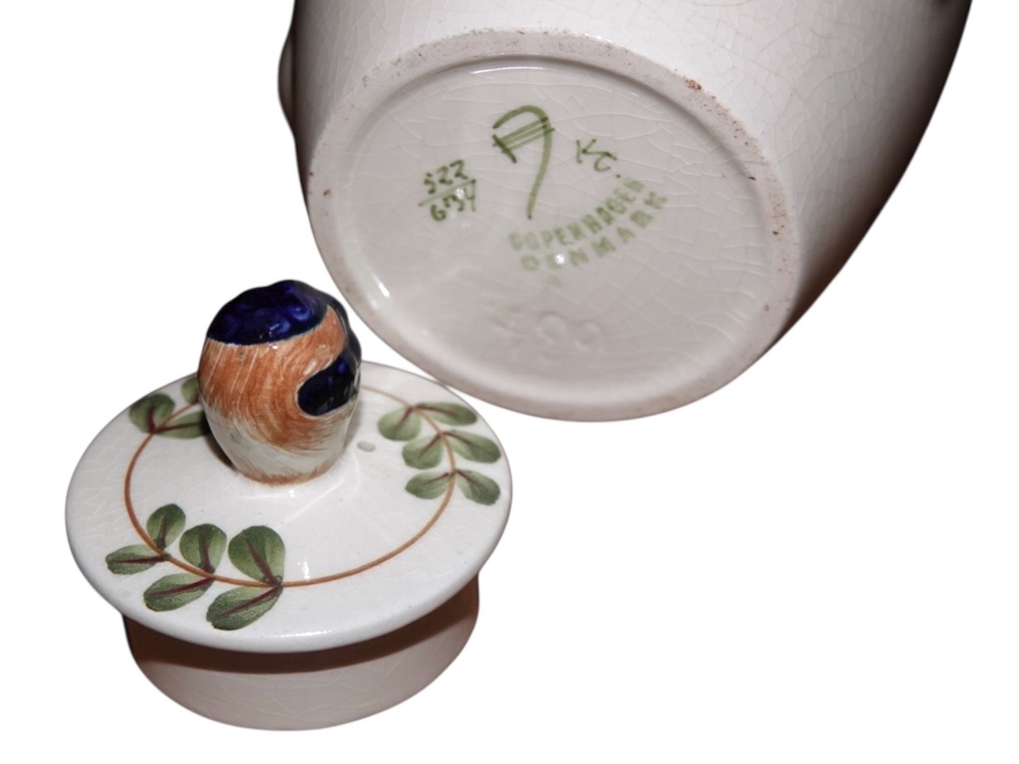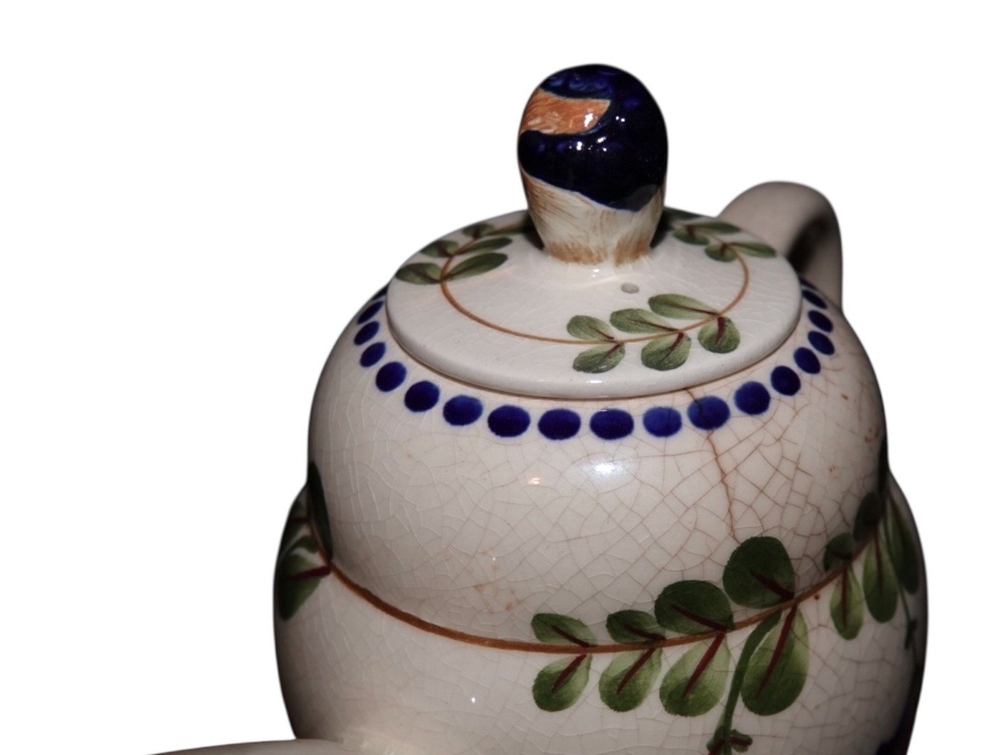There is a hairline crack at the top, please see picture #3. There are also crazings and discoloring in the glaze.