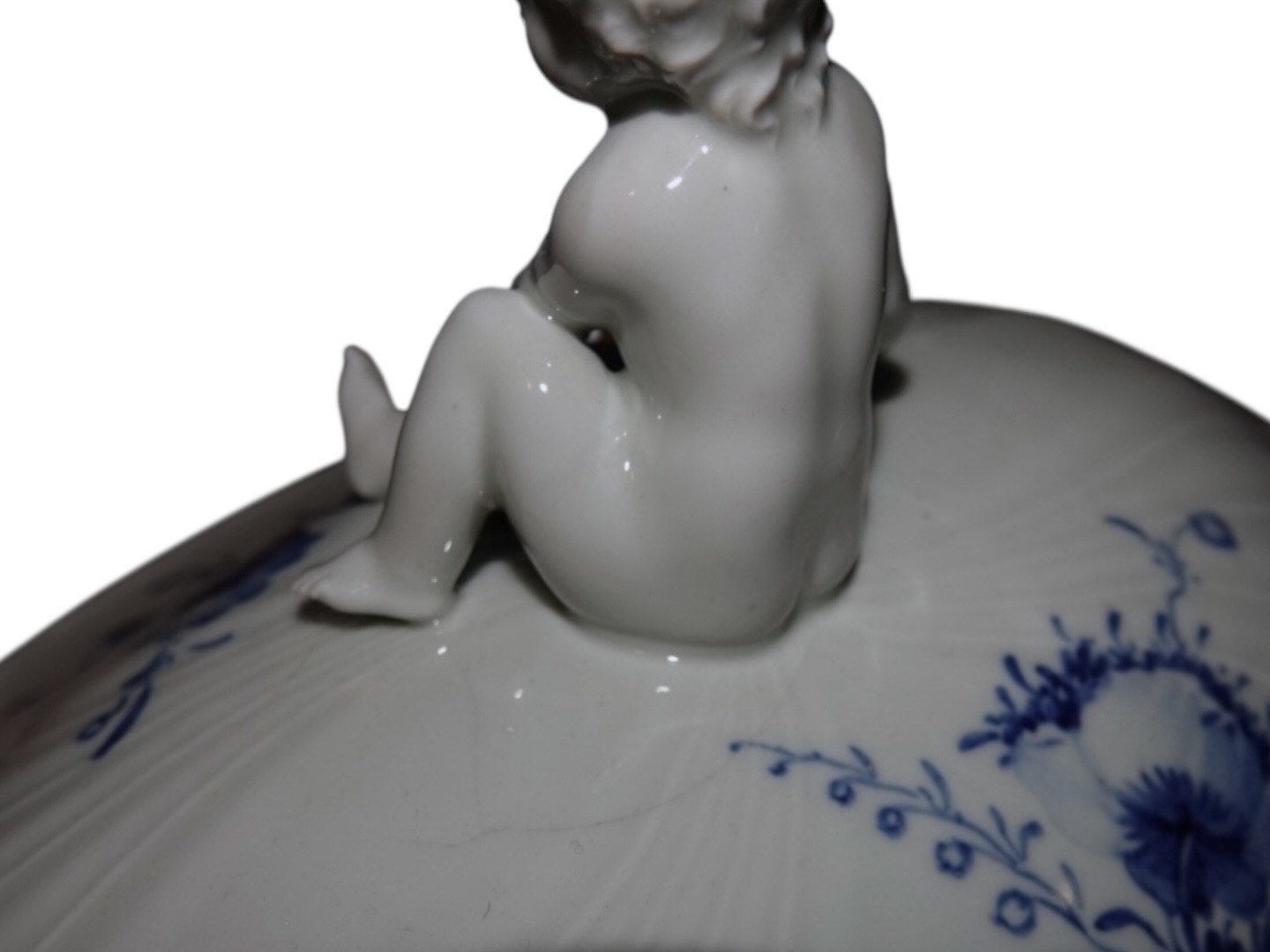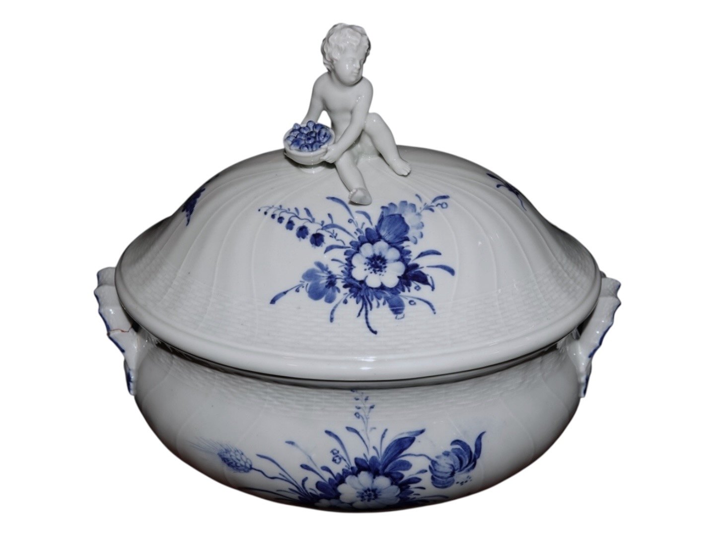 Royal Copenhagen Blå Blomst Svejfet, ekstra stor suppeterrin med låg med figur af dreng (putto). Det er en tidlig udgave, hvor porcelænet er gråt fremfor hvidt.Varen er på fjernlager. Bestil online, eller kontakt os, hvis du vil se den i butikken — vi kan ofte have den klar samme dag.