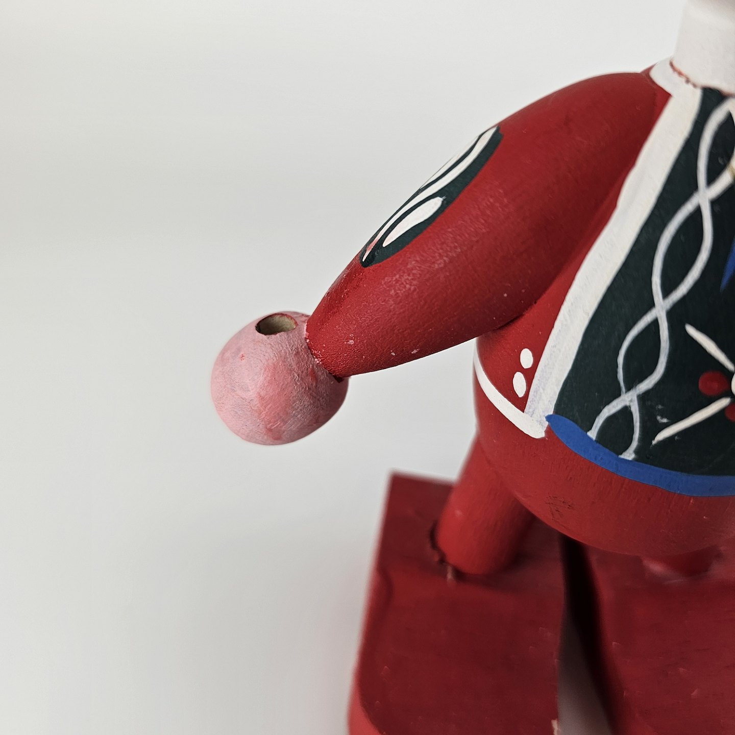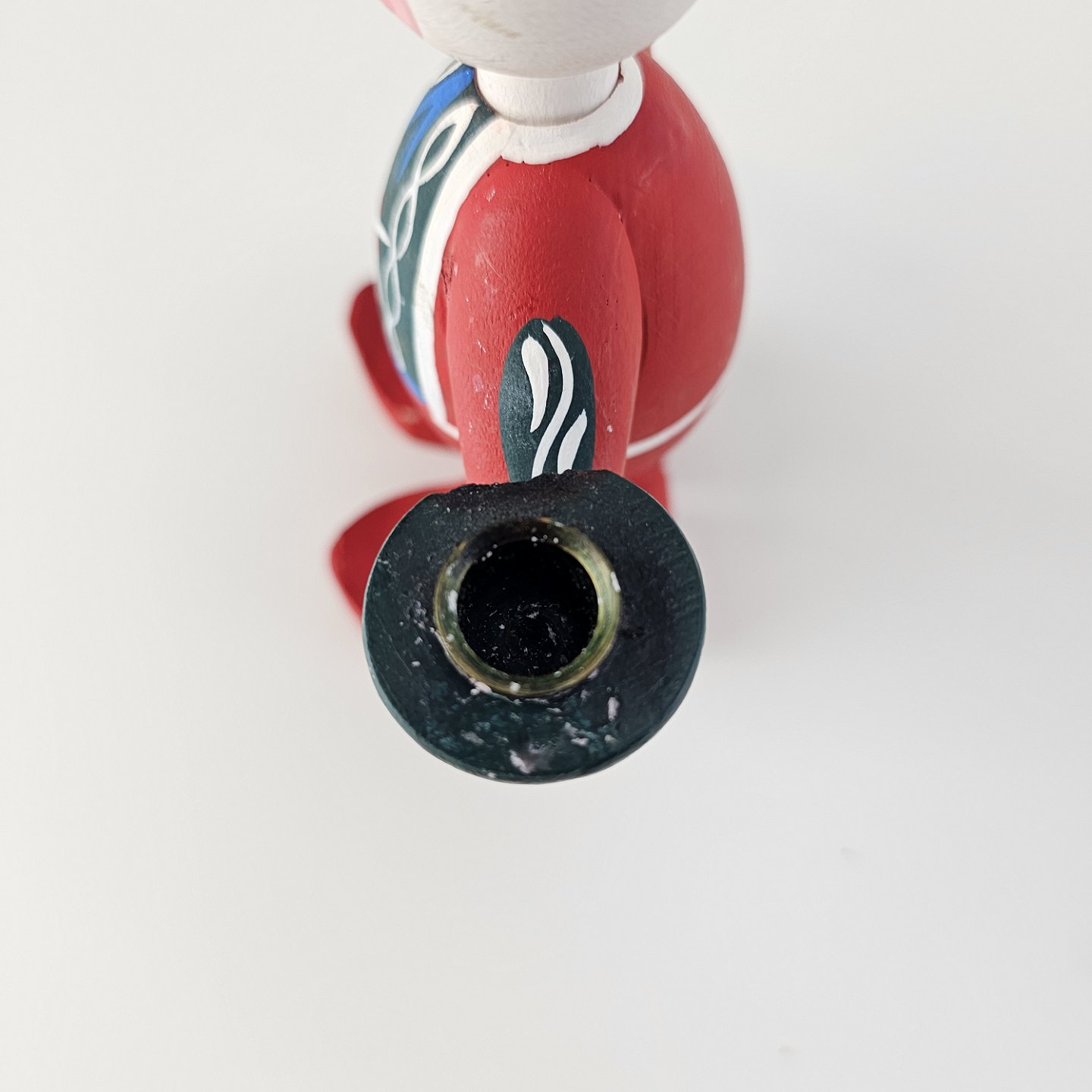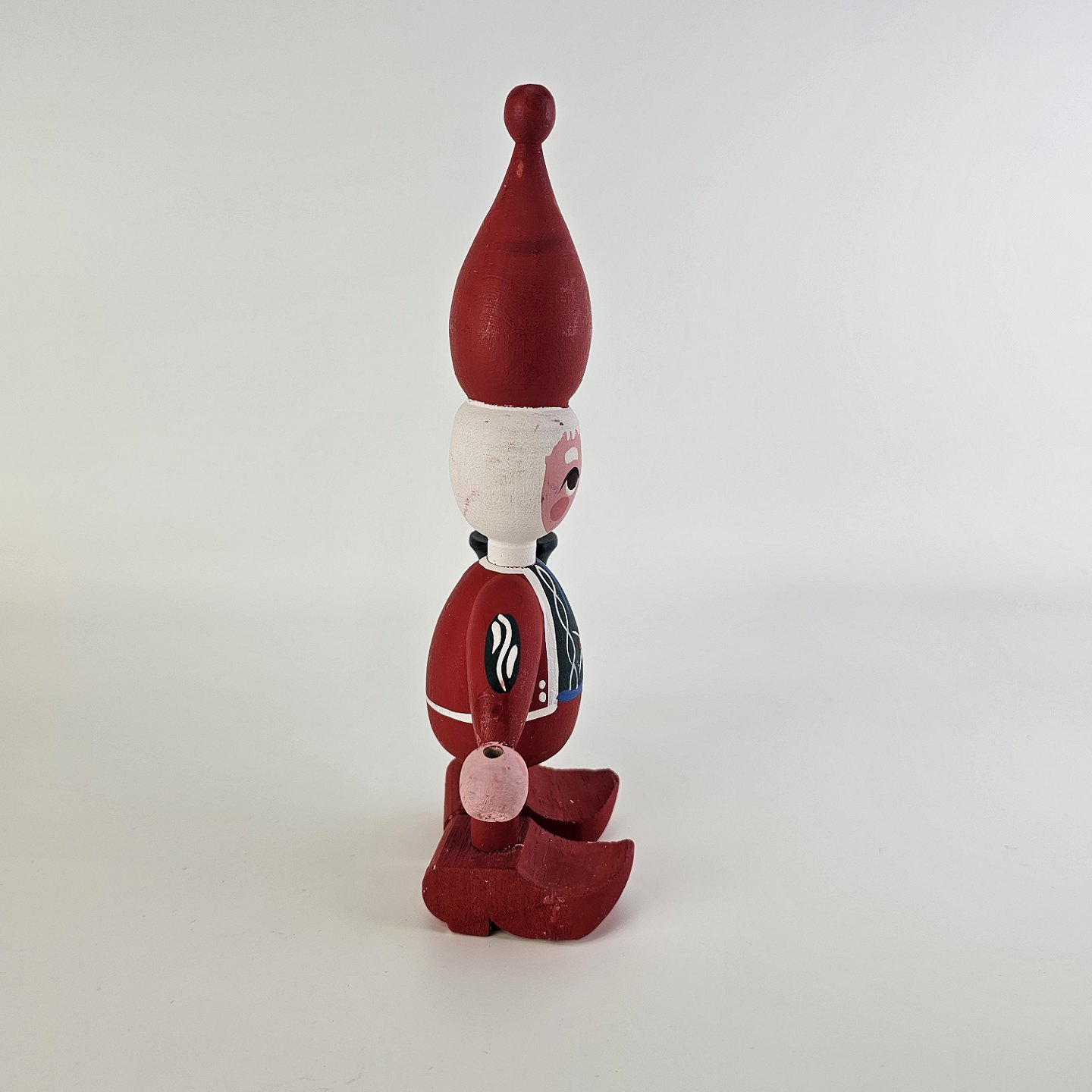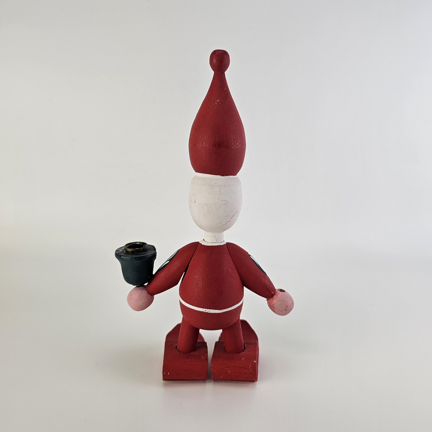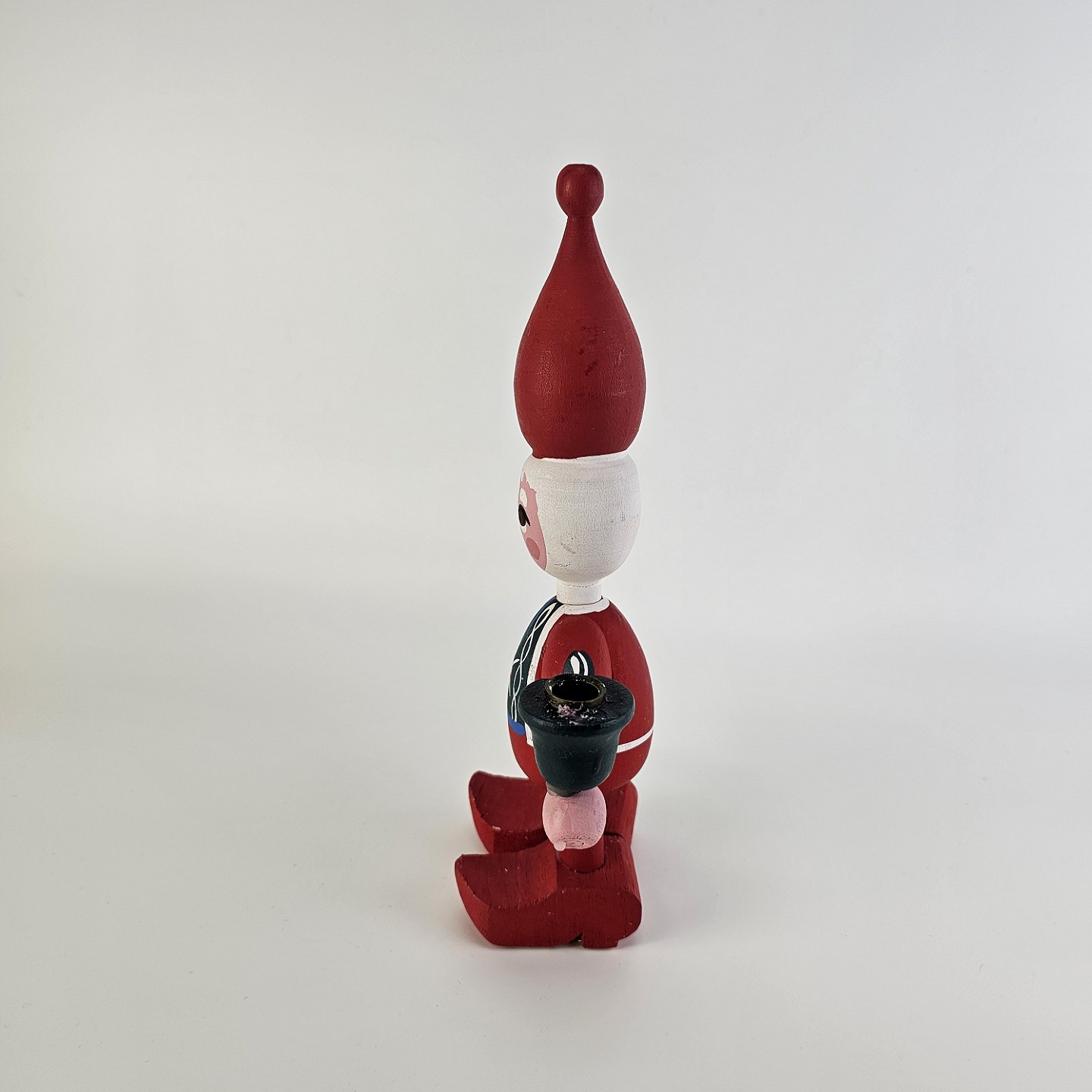 En håndmalet figur i træ med motiv af en nisse med en kerteholder Nr. 0001033
