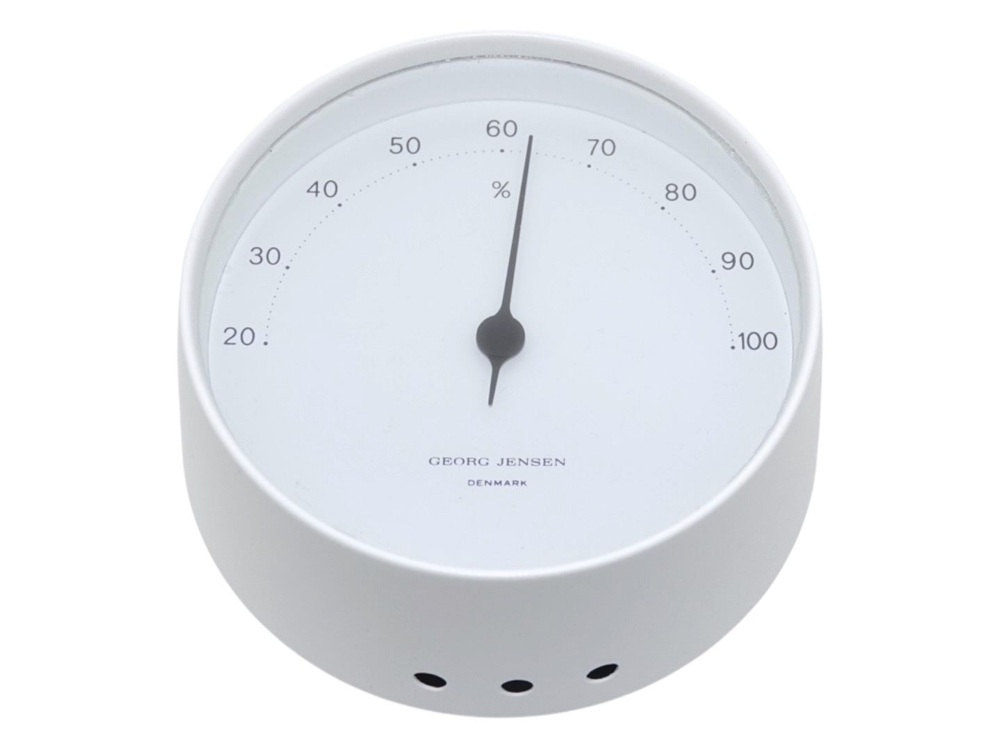 Georg Jensen Hygrometer i hvid kasse med hvid skive.Et hygrometer måler luftfugtighed.
