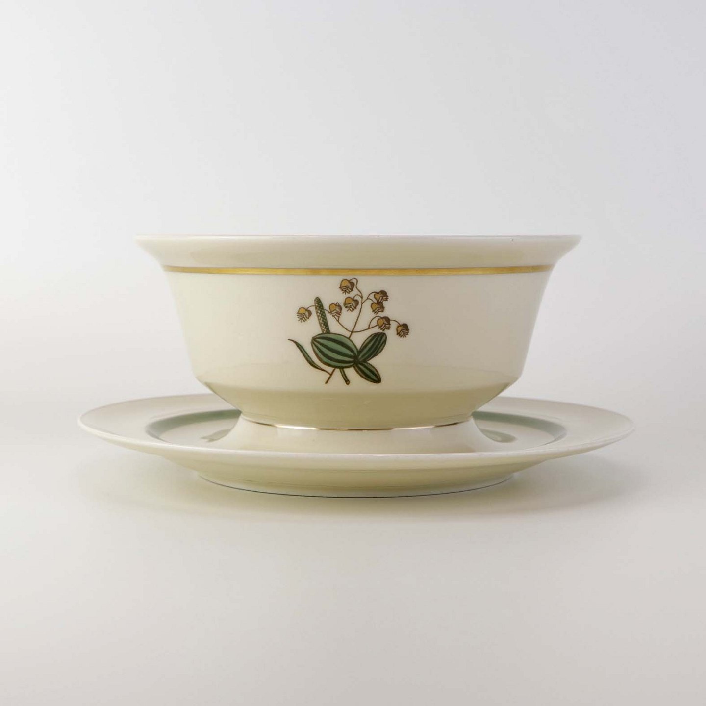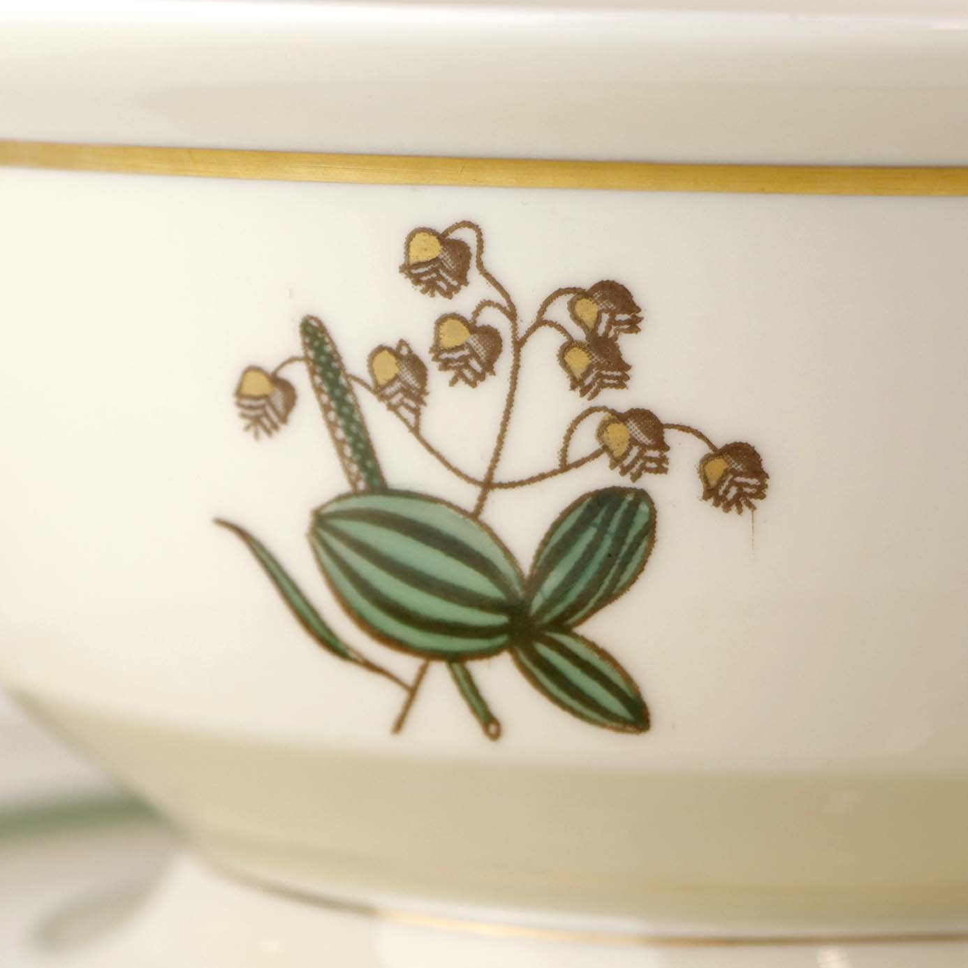 Stel i glat råhvidt porcelæn dekoreret med lysegrøn stribe og guldkant samt motiv af hjertegræs.