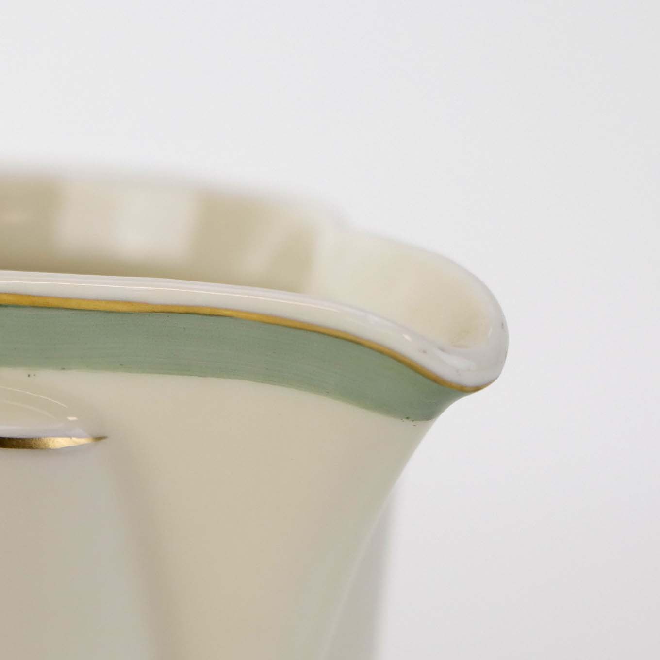 Stel i glat råhvidt porcelæn dekoreret med lysegrøn stribe og guldkant samt motiv af hjertegræs.