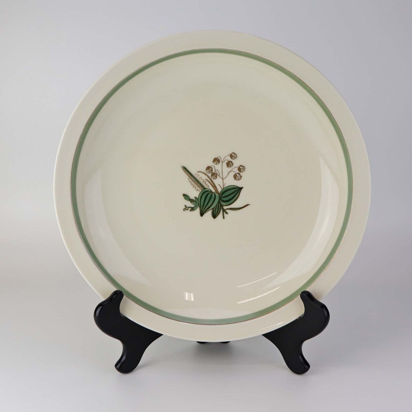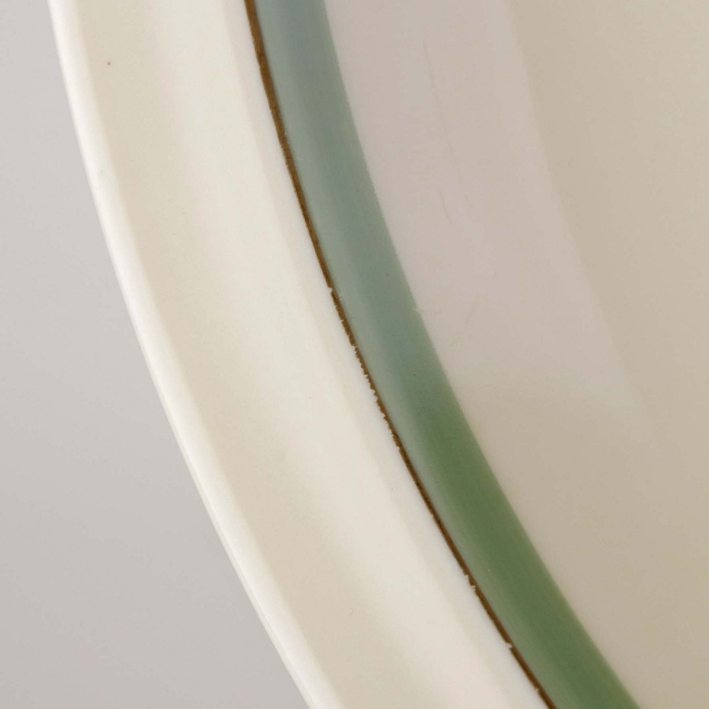 Stel i glat råhvidt porcelæn dekoreret med lysegrøn stribe og guldkant samt motiv af hjertegræs.