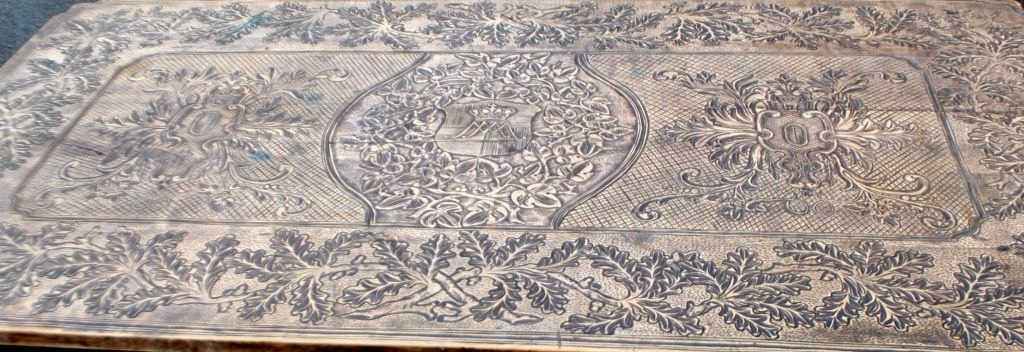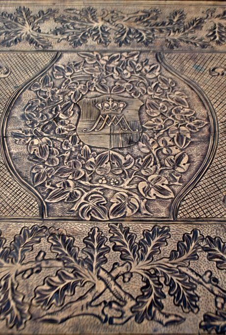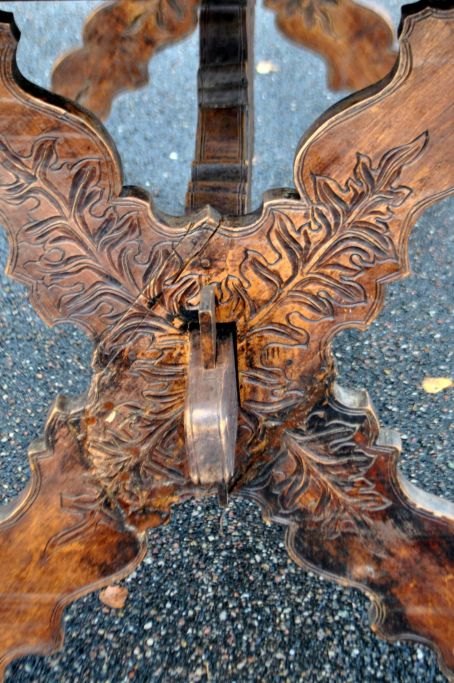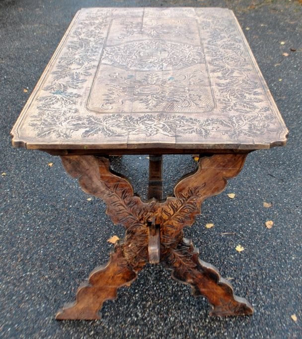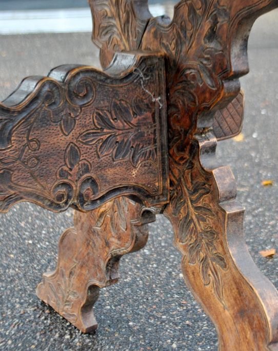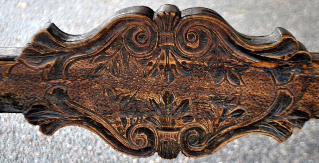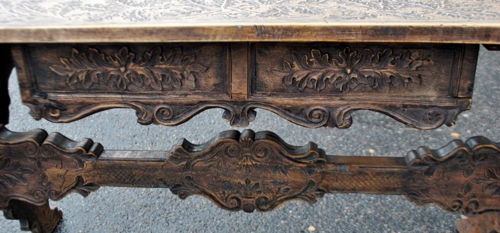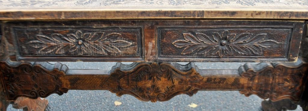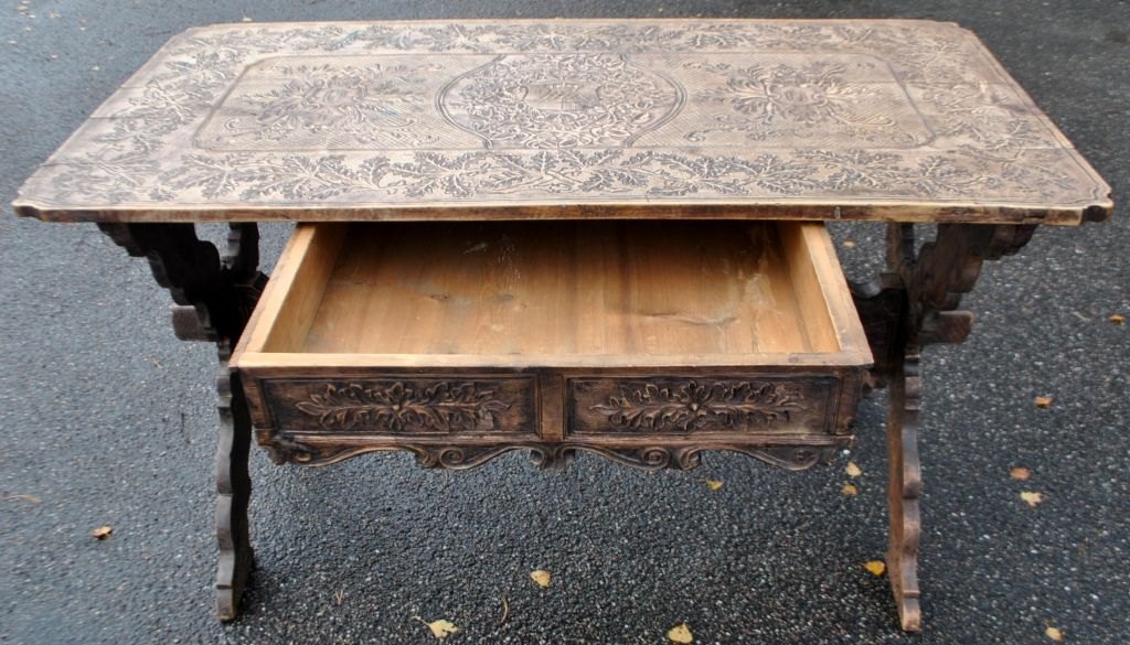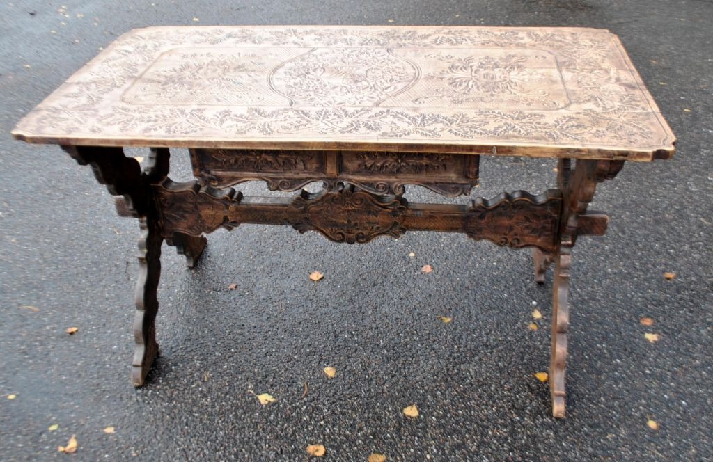 Antiker langer Tisch mit Schnitzereien und Schublade, 19. Jahrhundert. Unzählige Schnitzereien auf Platte, Schublade, Beinen und Sockel. In der Mitte eine Schnitzerei einer Herzogskrone. Wahrscheinlich Deutschland. L.: 141 cm. B.: 73 cm. T.: 77 cm.Bestellnummer: 28454