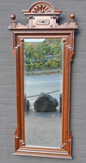 Großer dänischer Flurspiegel, 1870-1880. Nussbaum und Mahagoni. Platte mit Verzierungen und Kugeln. Abgeschrägter Spiegel. H.: 159 cm. B: 67 cm.Bestellnummer: 28322
