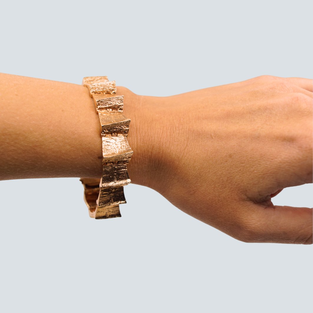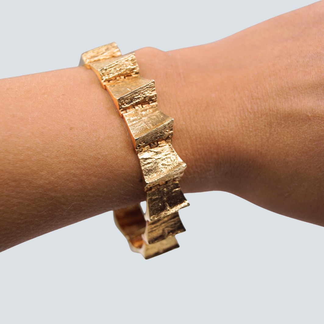 Toftegaard; Armbånd i 14 kt. guld. Sammensat af led med rustik overflade. Med kasselås, samt to sikkerhedslåse. L. 18,5 cm.