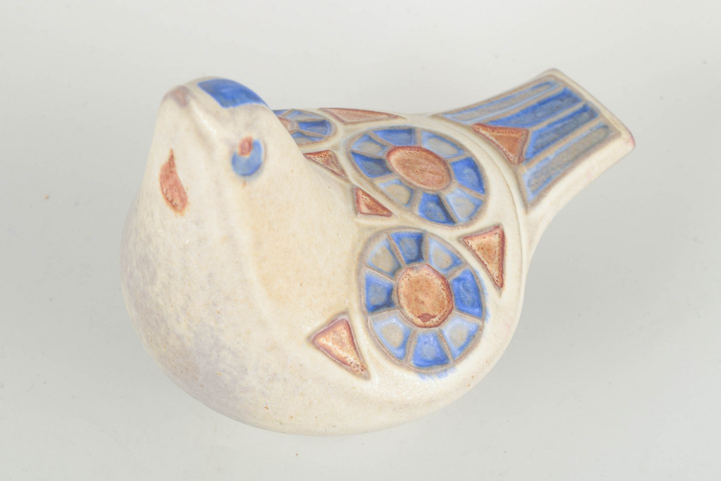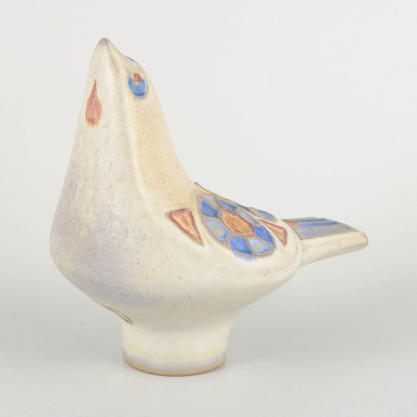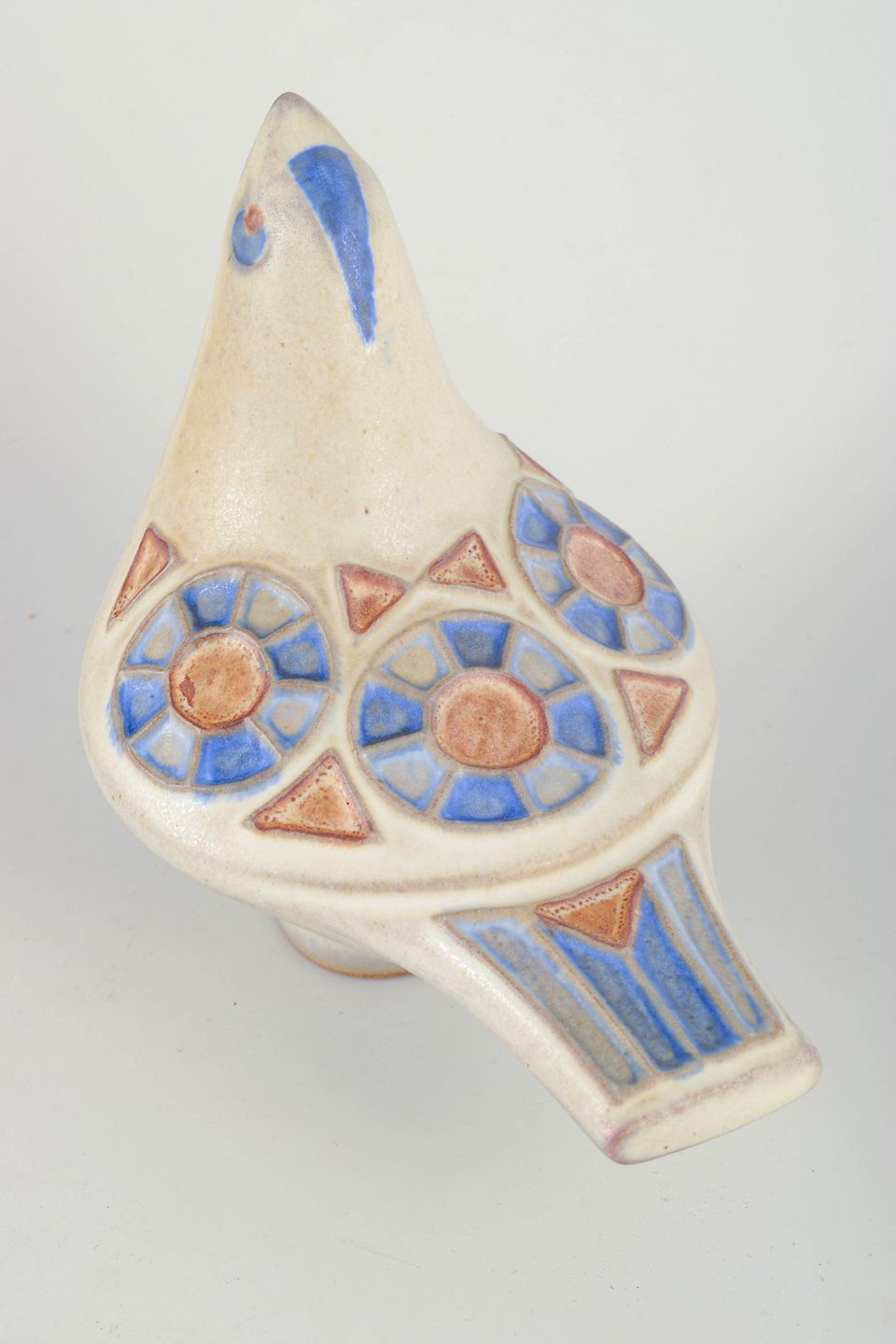 Skulpturel fuglefigur i glaseret stentøj med hånddekorerede blomster- og geometriske motiver i blå og terrakotta nuancer på lys bund. Signeret under bunden med værkstedsstempel og originalt mærkat bevaret.