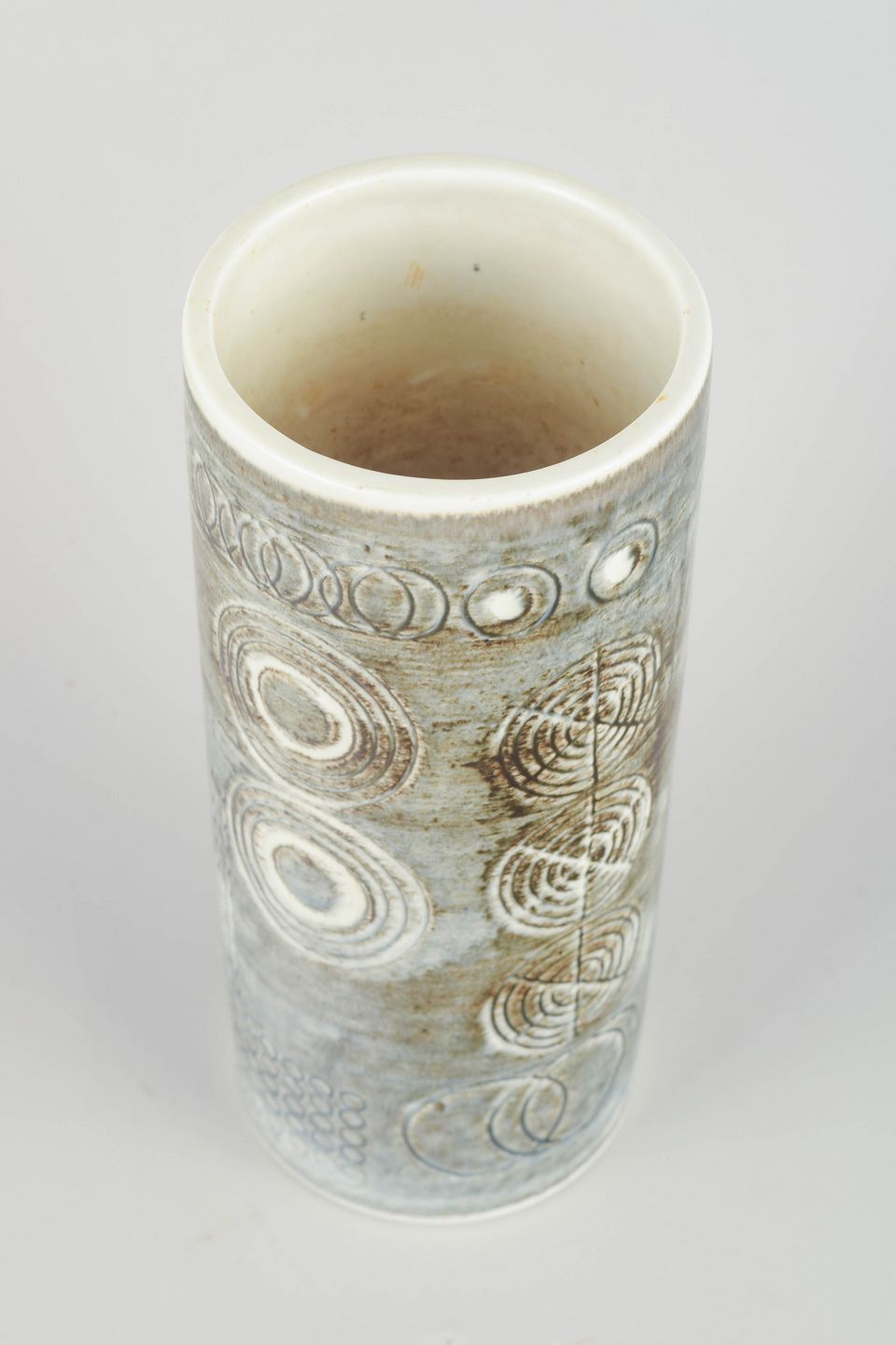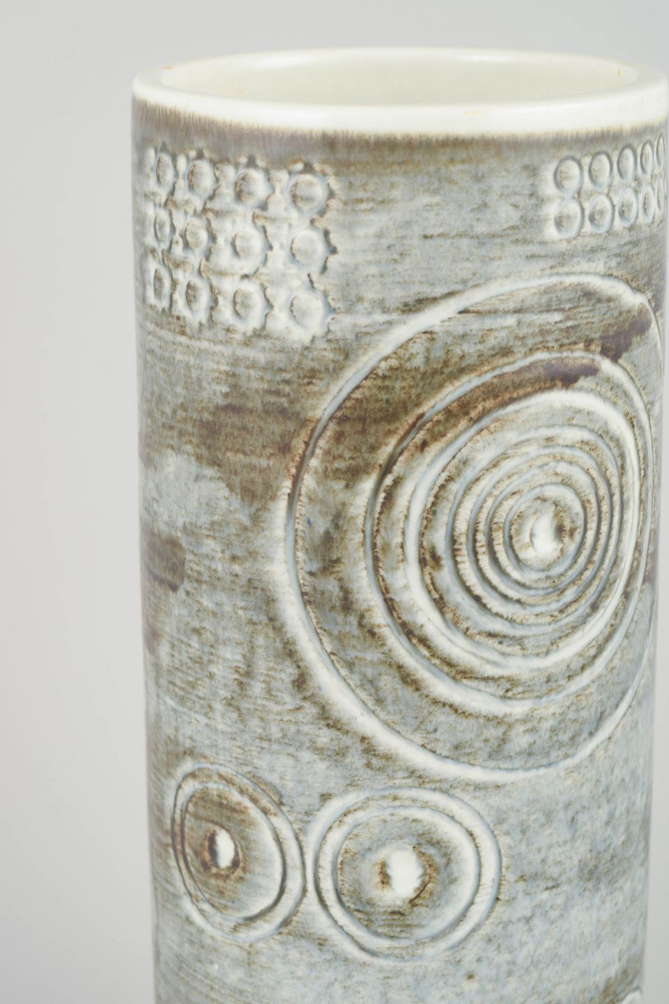 Hånddrejet cylinderformet vase i stentøj med indgraveret cirkulært relief og mat, køligt grå/blå glasur i nuancerede jordtoner — karakteristisk for Anderssons organiske og naturinspirerede formsprog.