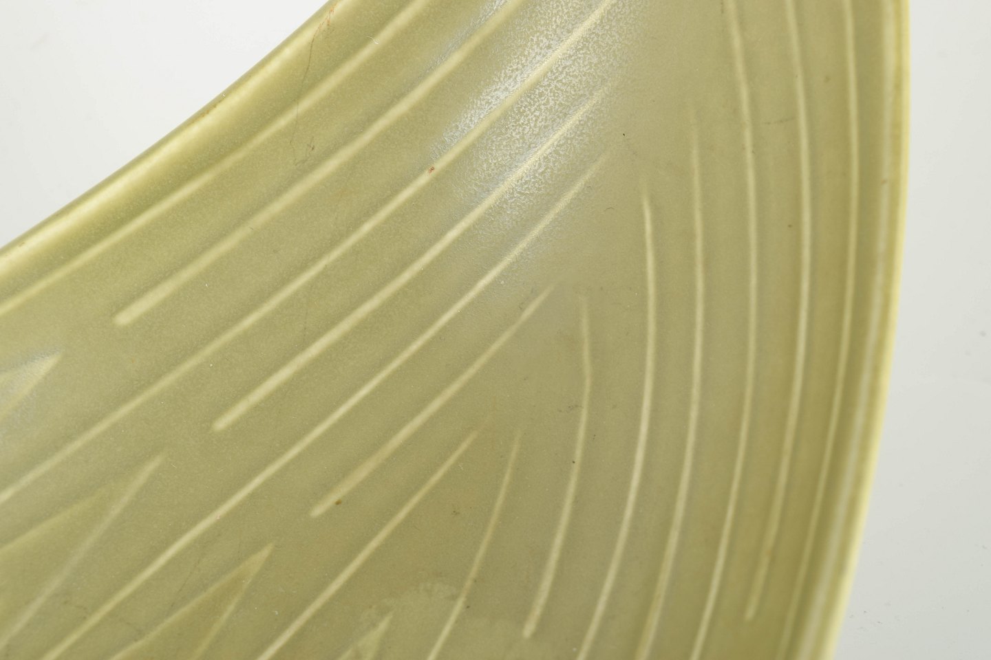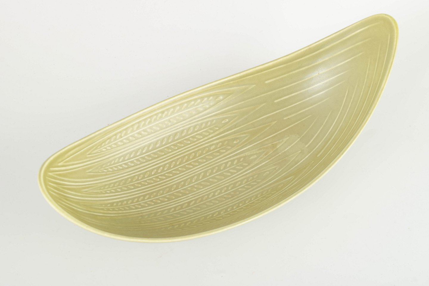 Organisk formet dekorationsskål i glaseret stentøj med indvendigt indridset mønster og elegant buet, bådformet silhuet.