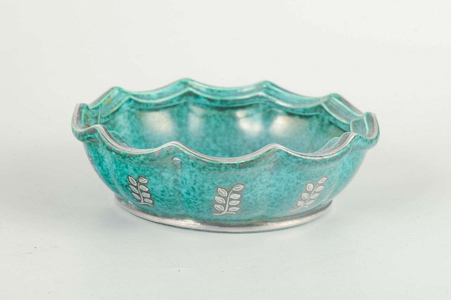 Lav rund skål i turkisglaseret stentøj med indlagte sølvdekorationer langs siderne og i bunden. Let bølget, formpresset rand.