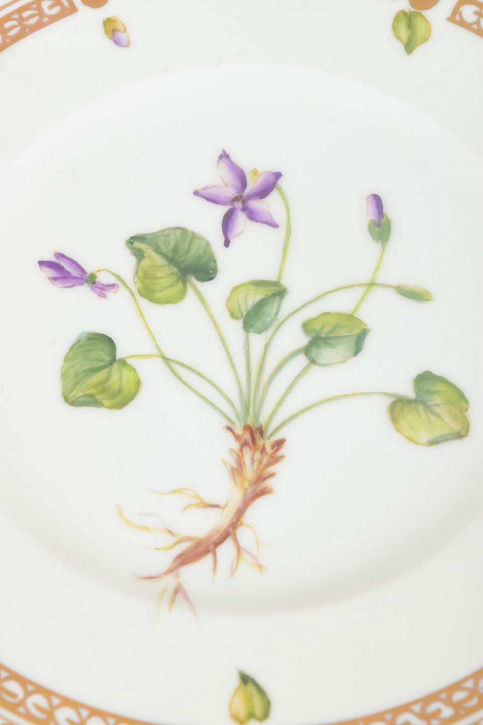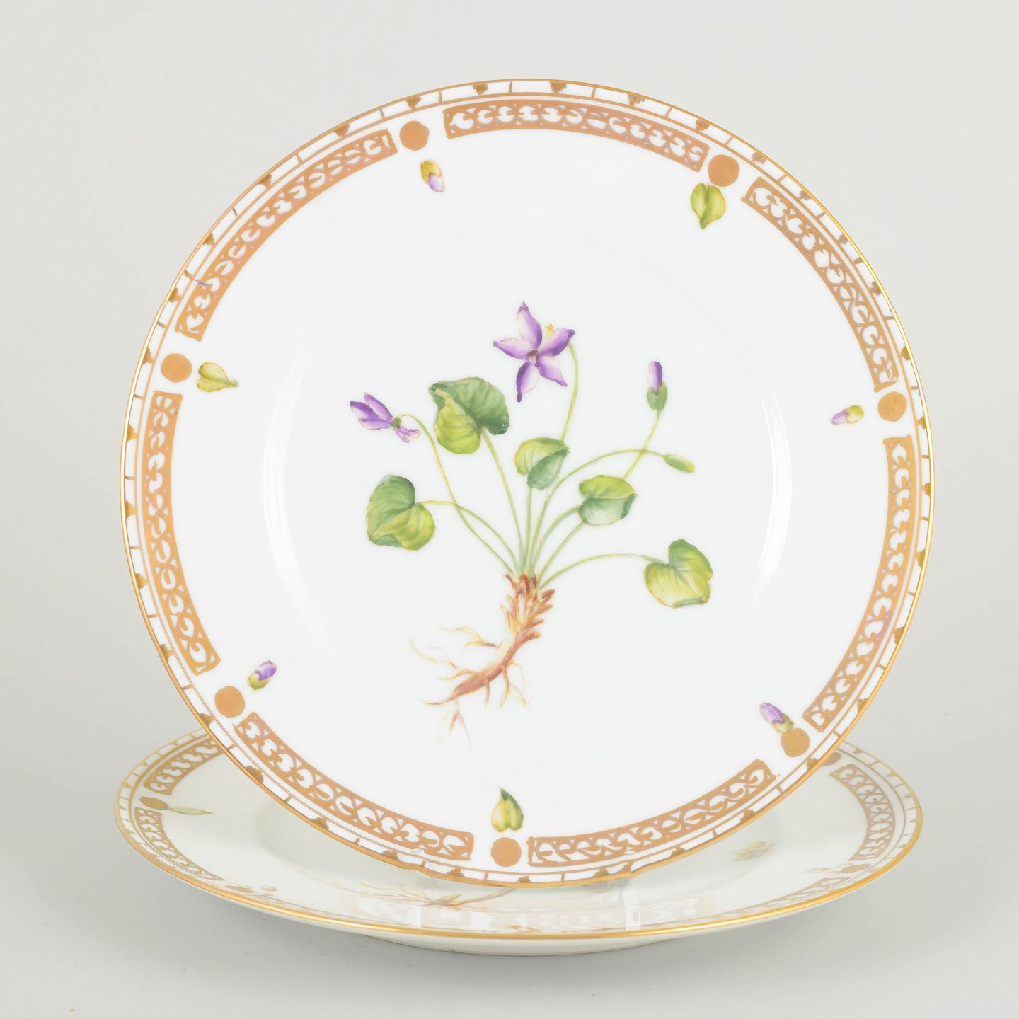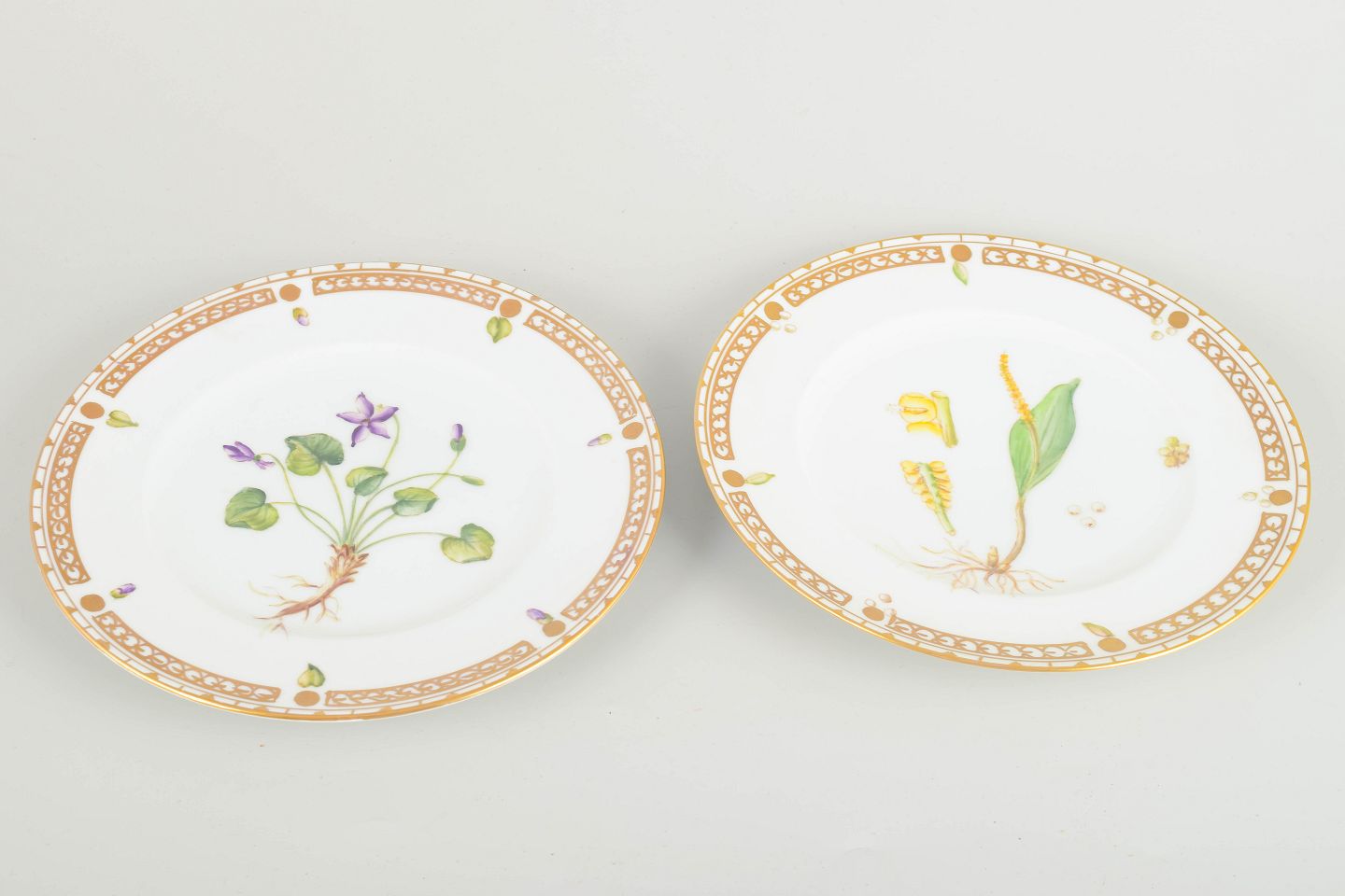 To porcelænstallerkener med håndmalede botaniske motiver og guldbemaling langs kanten. 2. sortering.