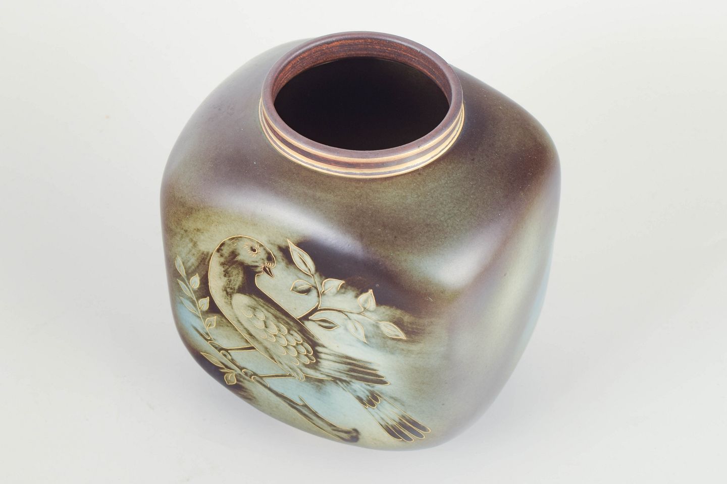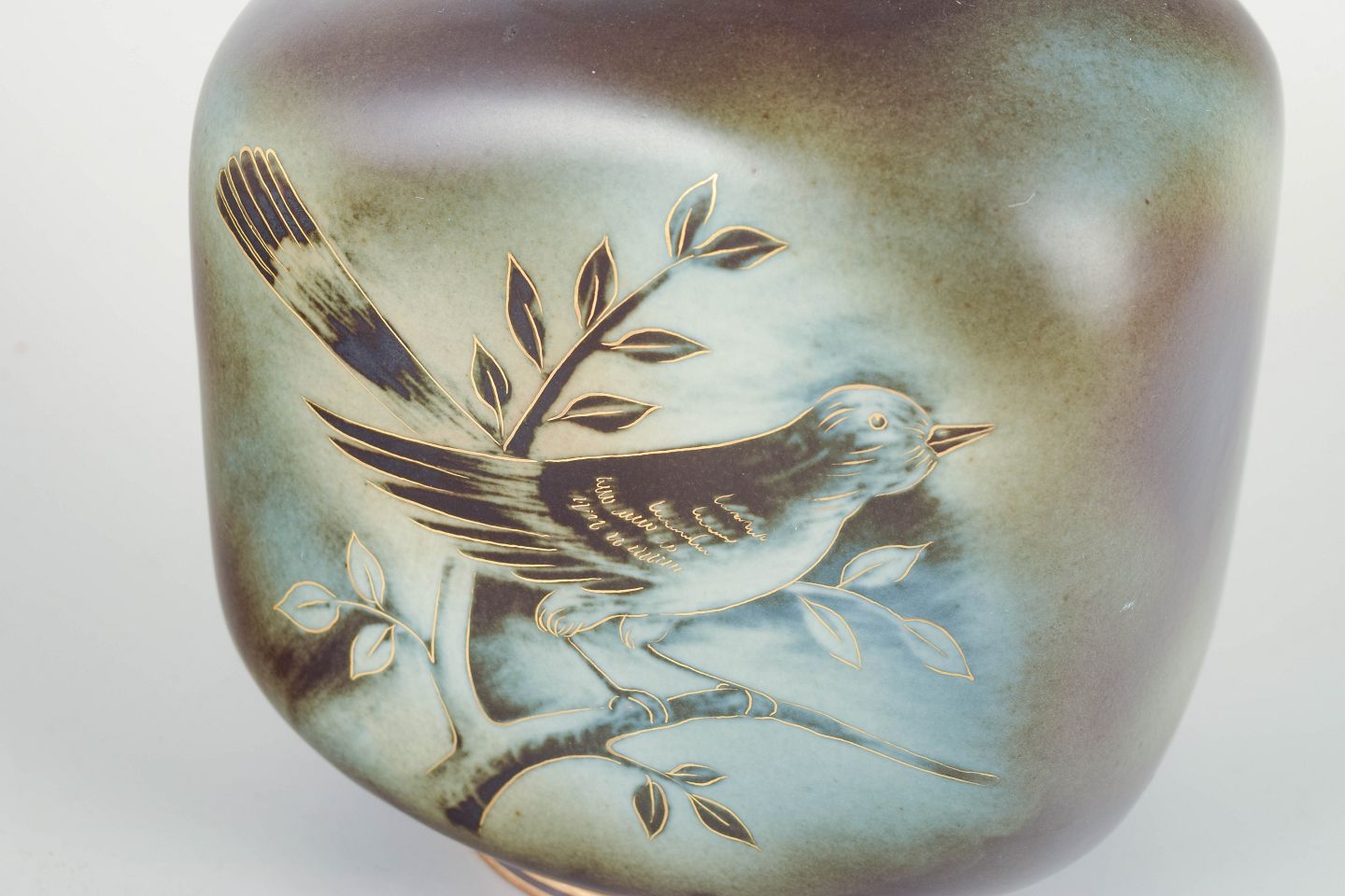 Håndmalet keramisk vase med motiv af eksotisk fugl og løvværk, dekoreret med håndpåført guldstaffering langs kant og fod. Blød, næsten iriserende glasuroverflade i grønne og blåbrune nuancer – et karakteristisk eksempel på Nylunds elegante naturalistiske formsprog.
