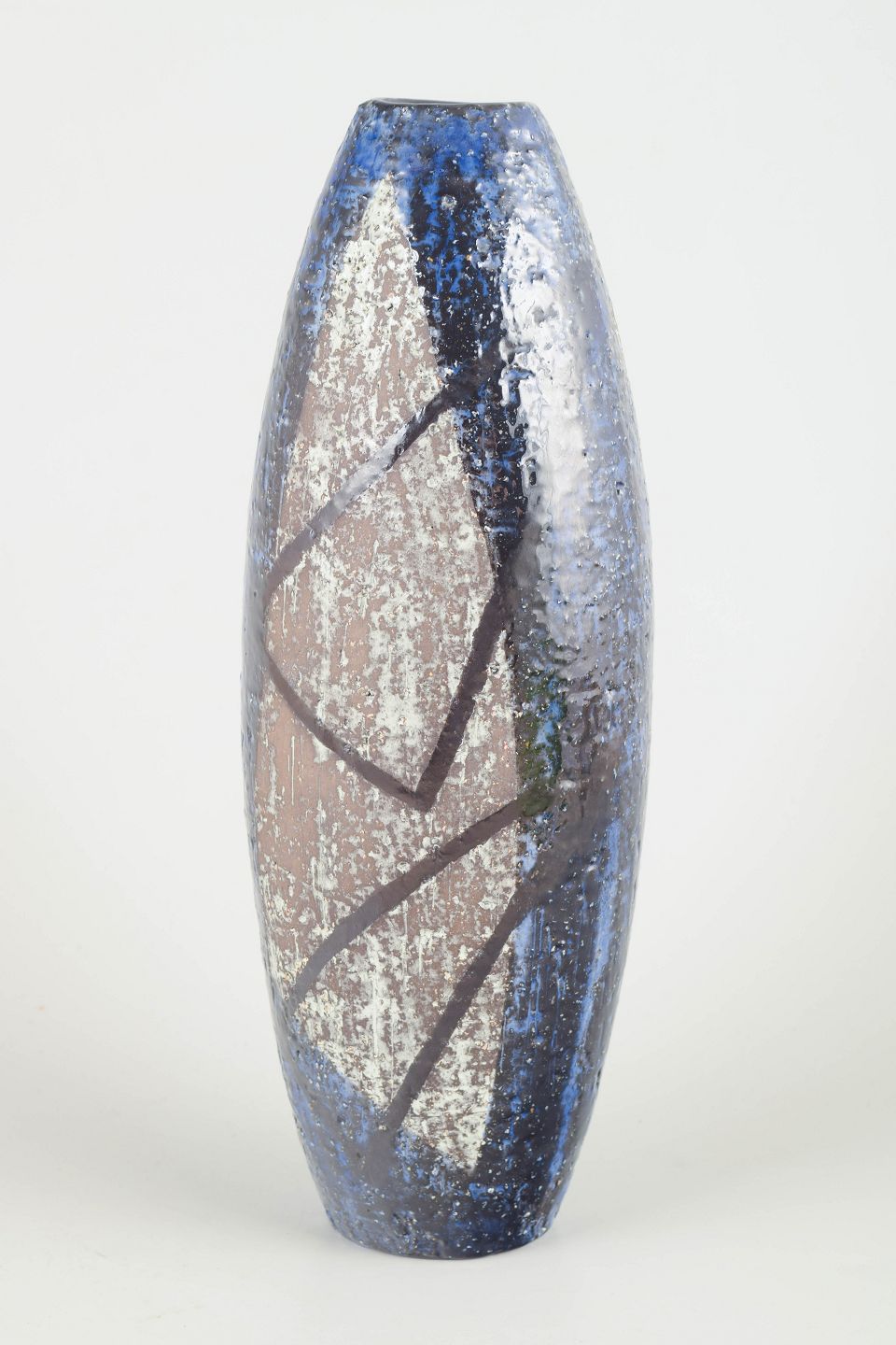 Elegant højtformet vase i chamotteret stentøj med karakteristisk reliefglasur i blå, sølv- og brunlige nuancer, dekoreret med abstrakte organiske linjer – et typisk eksempel på Atterbergs modernistiske formsprog for Upsala Ekeby.