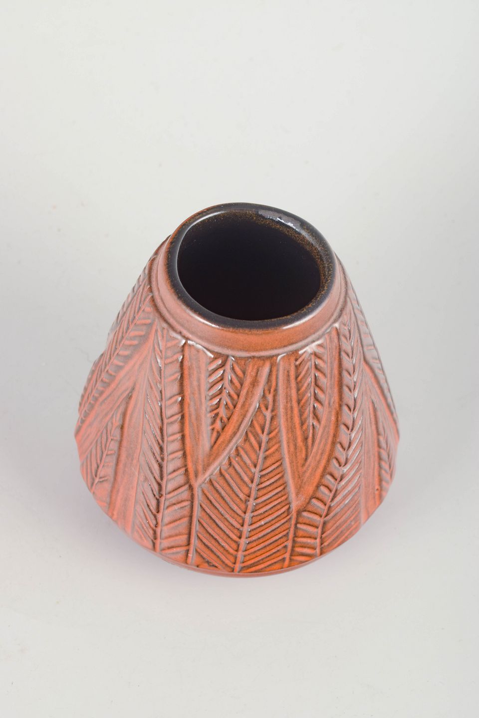 Konisk formet vase i chamotteler med dybrelief-dekoreret bladmotiv og typisk varm rødbrun glasur. Indvendig mørk glasur. Model 4583.