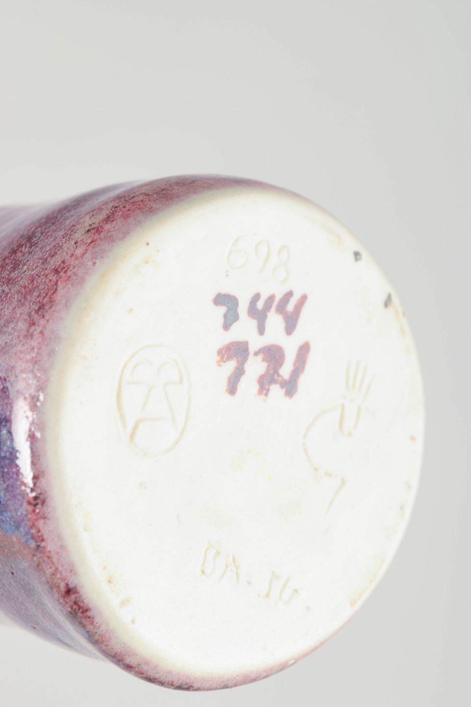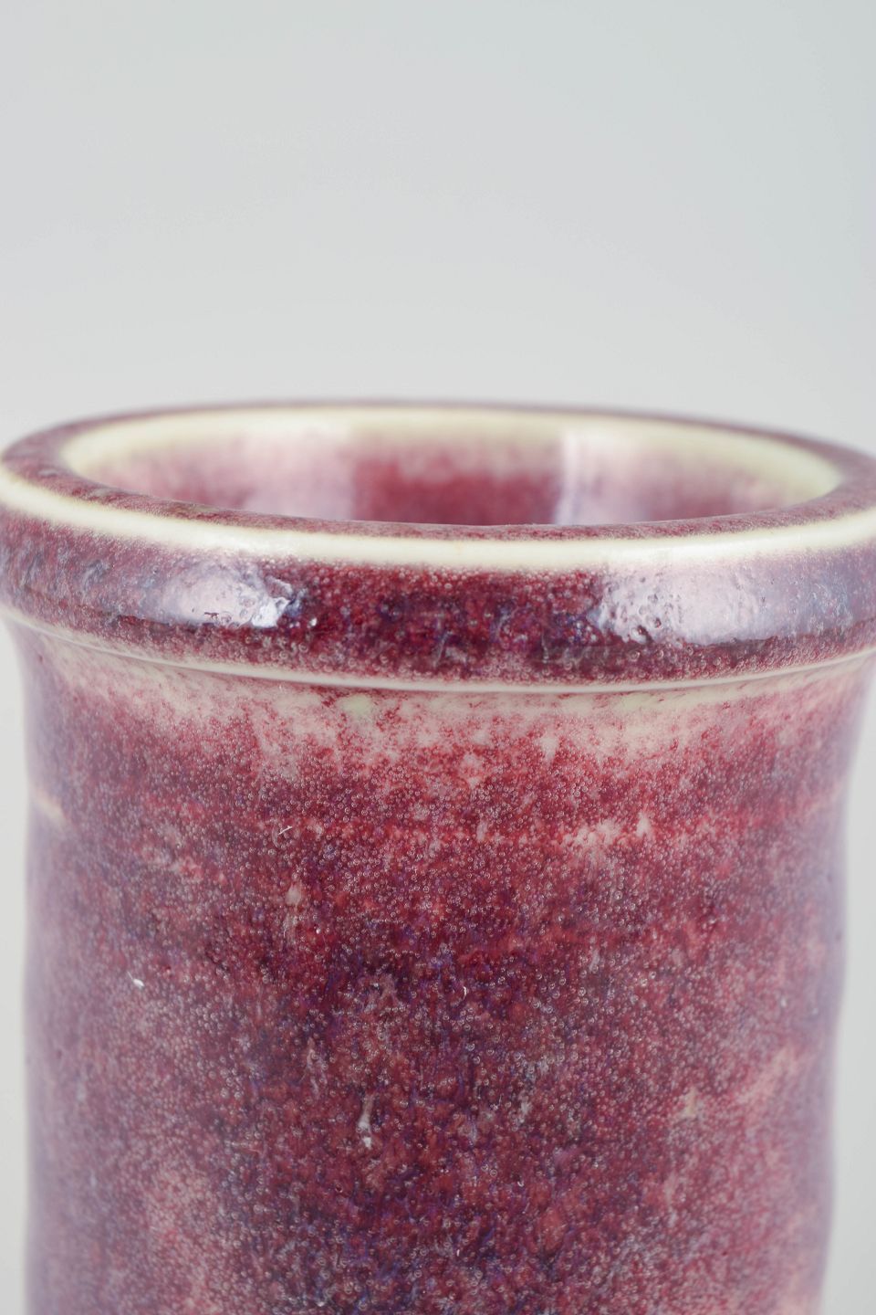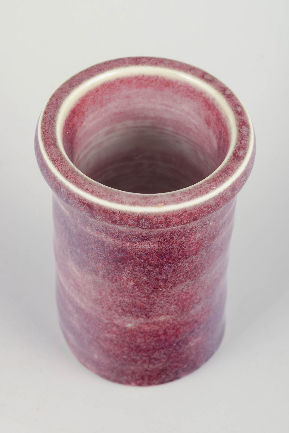 Cylinderformet studiovase i drejet stentøj med eksperimentel rosa-lilla testglasur og lys kantprofil, signeret med monogram under bunden.